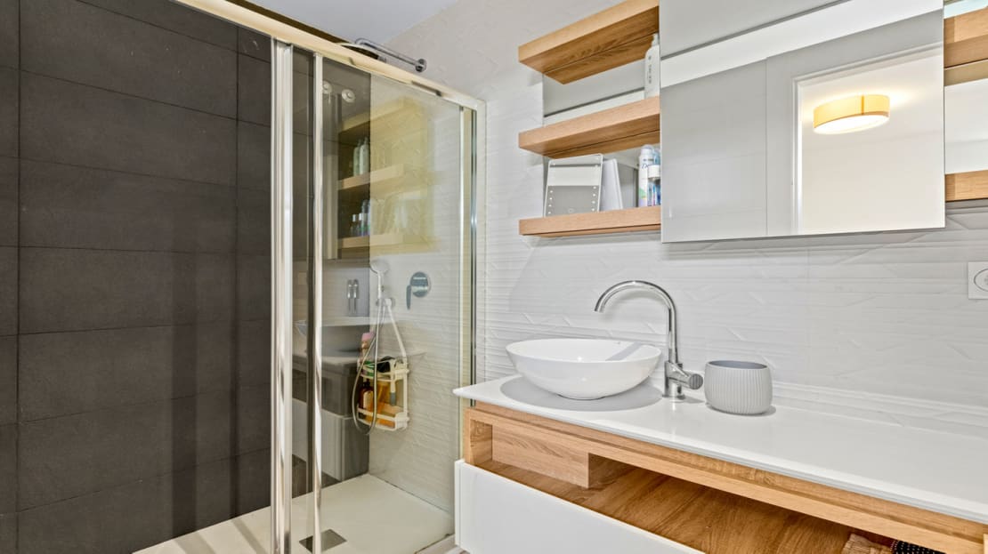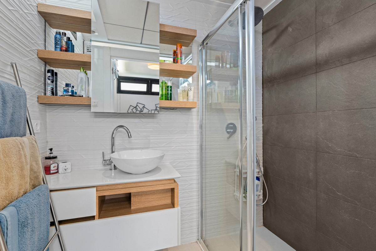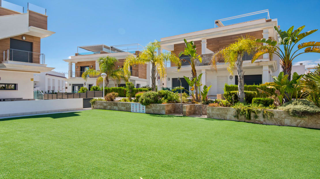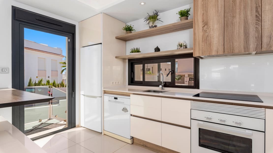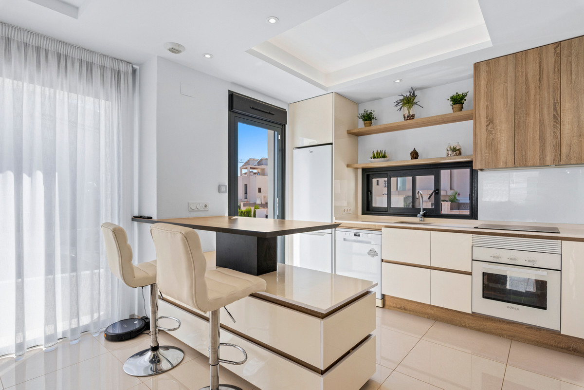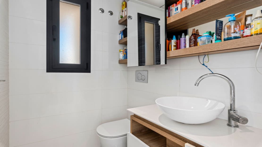 This property, built in 2017, is perfectly located in the popular Riva complex in Ciudad Quesada. On the ground floor there is a bathroom and a large living room with an open kitchen. On the underground floor there are two bedrooms with en-suite bathrooms and built-in wardrobes. On the first floor we find the main room, which has an en-suite bathroom and has access to a 5m2 balcony. On this floor we also find another room with access to a balcony and built-in wardrobes. The house also has a 5m2 solarium with a jacuzzi and incredible views of the surroundings and common areas. The solarium has an outdoor shower, artificial grass and awnings.