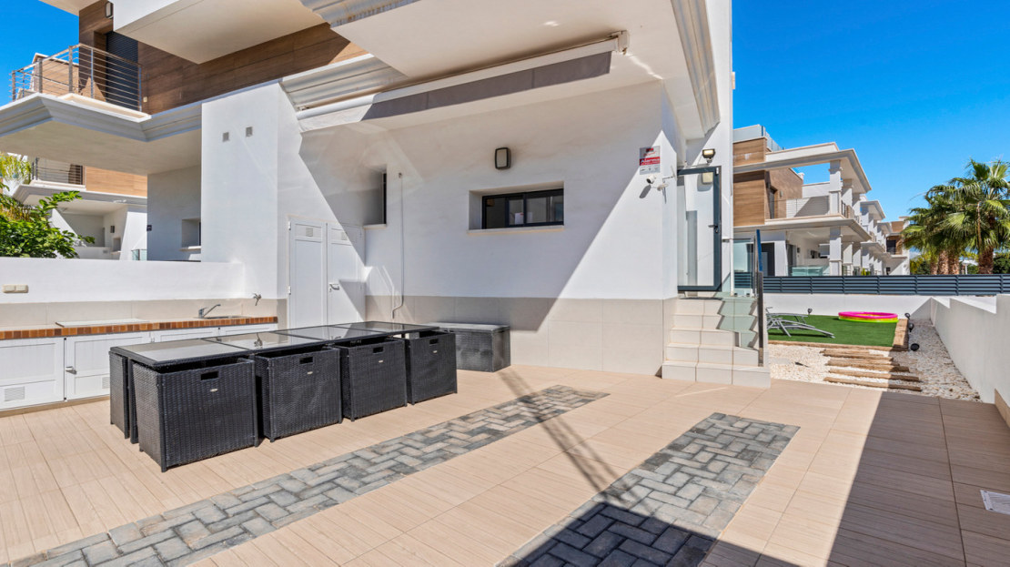 The property has two patios. One of them has artificial grass and sun loungers. In the other we find an outdoor kitchen area, storage space and an outdoor seating area. The property has parking space on the plot.