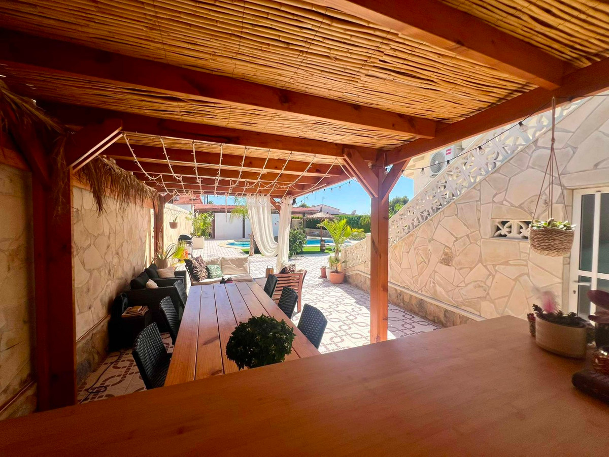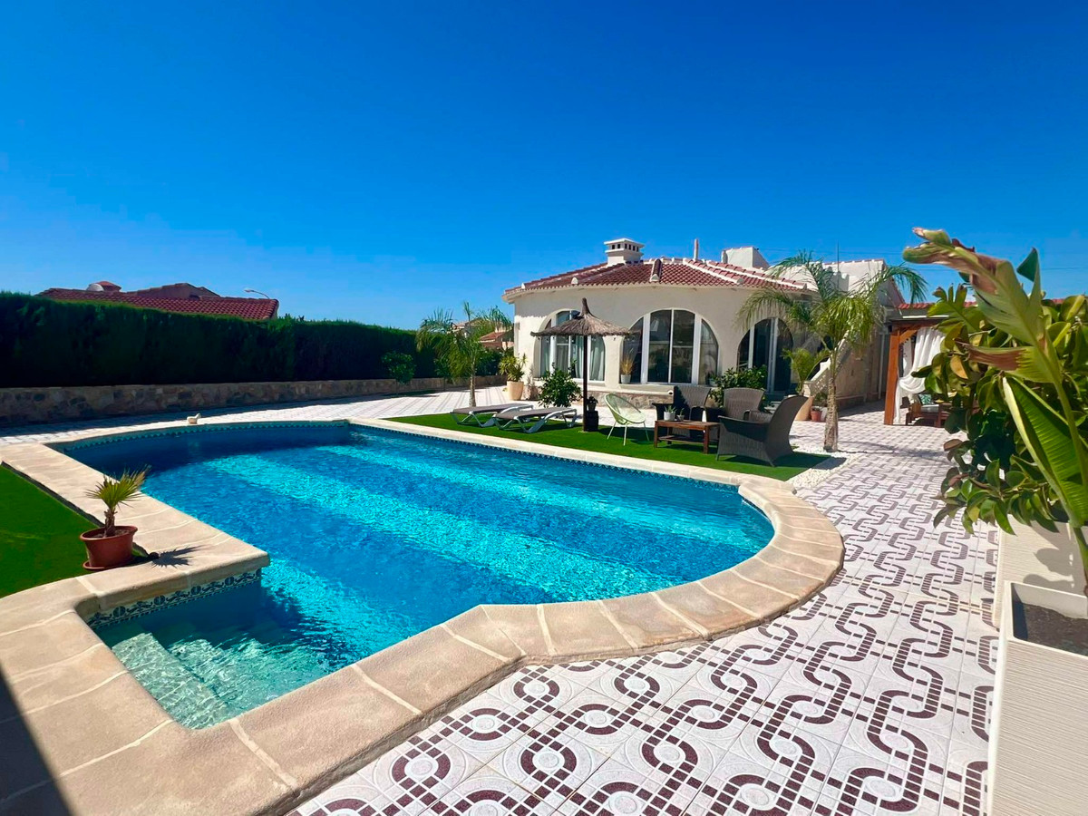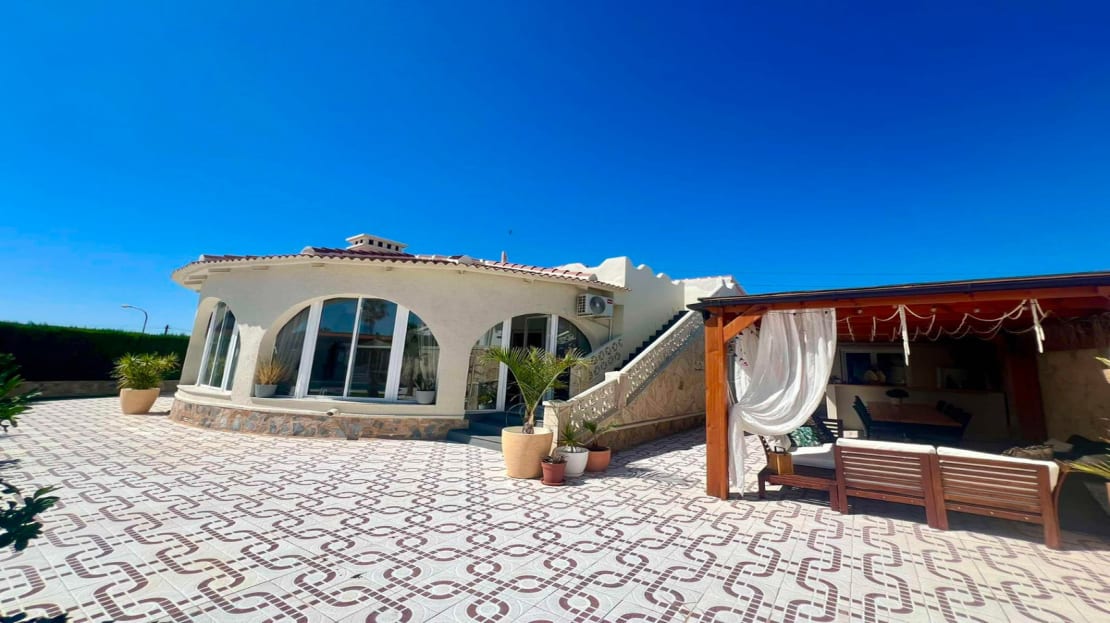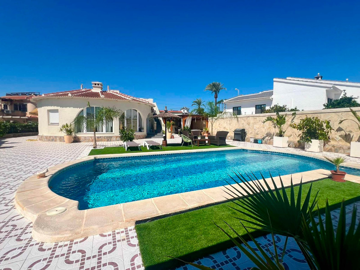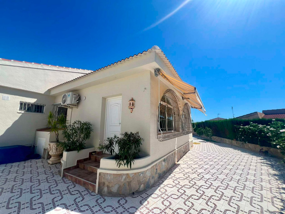 Beautiful finca style villa with guest house and private pool in the heart of Ciudad Quesada , walking distance to the main street yet very quiet.You enter the fully walled plot of 834 m2 with on the right side a separate garage of 36 m2 with high ceilings (ideal for a camper) and on the left side an integrated garage to the main house and also a storage room.The villa consists of a nice entrance with extra space that can be used as an office, then you have the living room with fireplace, an American kitchen, three bedrooms, the master with a dressing room and ensuite bathroom and another separate bathroom. At the back there is a veranda, recently glazed which provides extra living space with beautiful views of the private pool.In the garden there is a covered terrace with outdoor bar, which is ideal for relaxing. On the side of the house there is a staircase leading to the roof terrace, with beautiful views of the surroundings and the salt lakes. Under the stairs there is a laundry room. At the back of the garden you will find the recently modernized guest house , with a covered terrace , a living room ( also overlooking the pool) , a large kitchen , a storage room , a bathroom and a spacious bedroom with built-in closets. There is an outdoor shower and at the back of the casita also a built barbecue.The house is sold partly furnished, almost all rooms have air conditioning and fly screens.Only a few minutes walk to bars, restaurants, the aqua park. Ideally located because of the good connection to the motorway , 5 minutes drive to the golf, 20 minutes drive to the beautiful sandy beaches of Guardamar and La Mata, 30 minutes to Alicante airport and 50 minutes to Murcia airport.