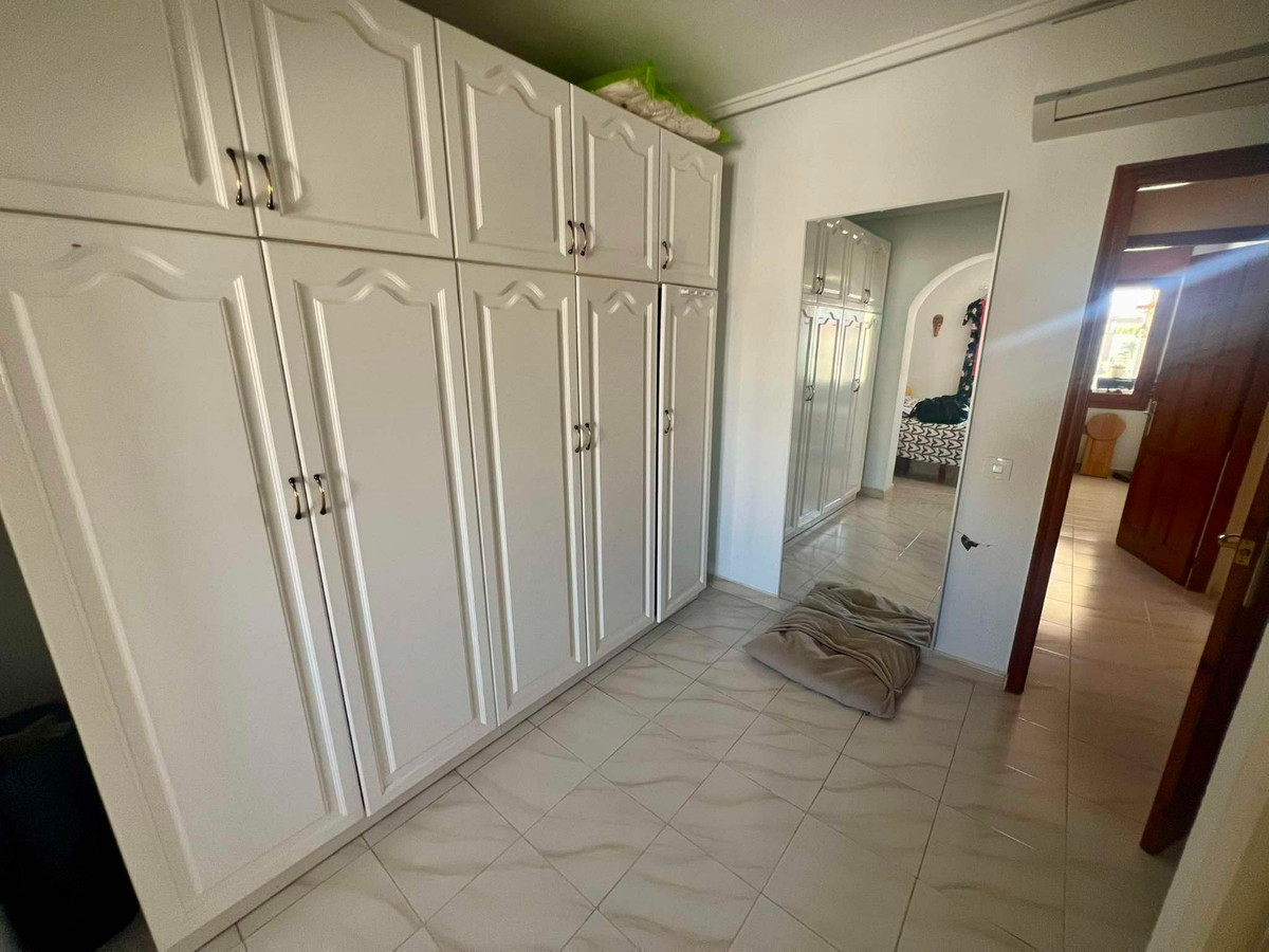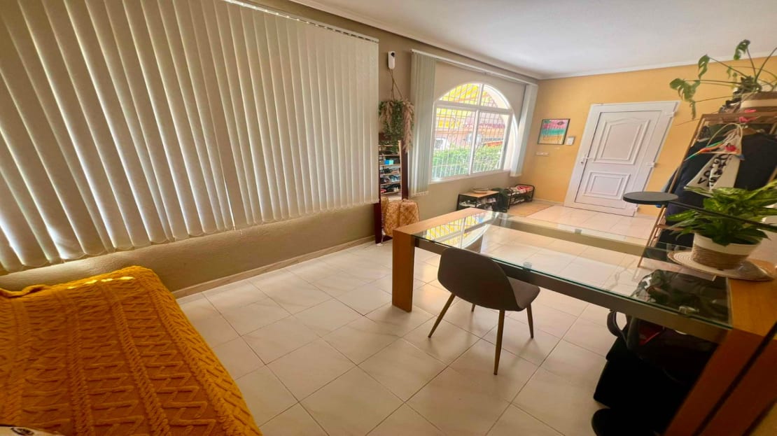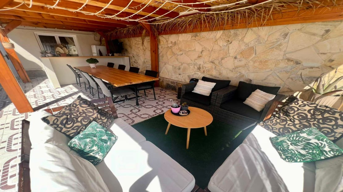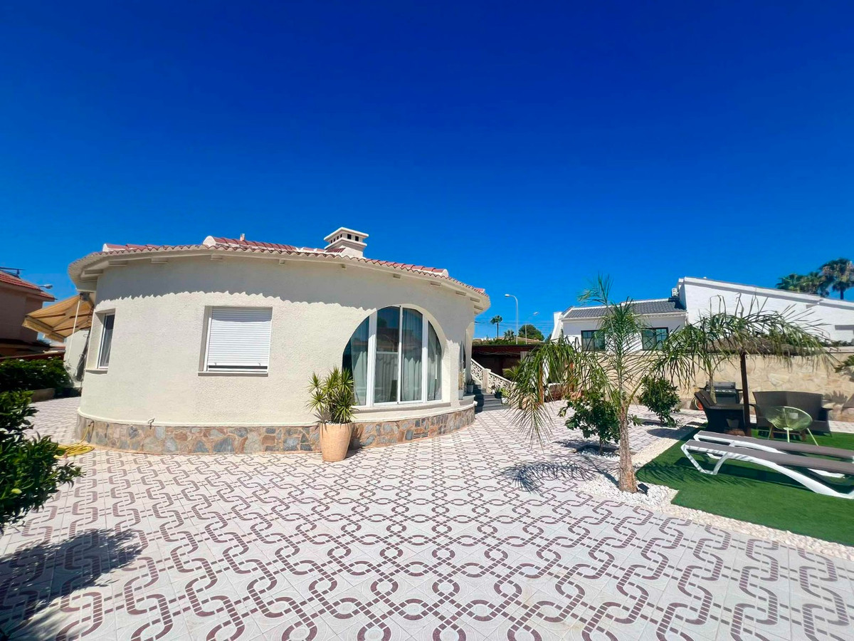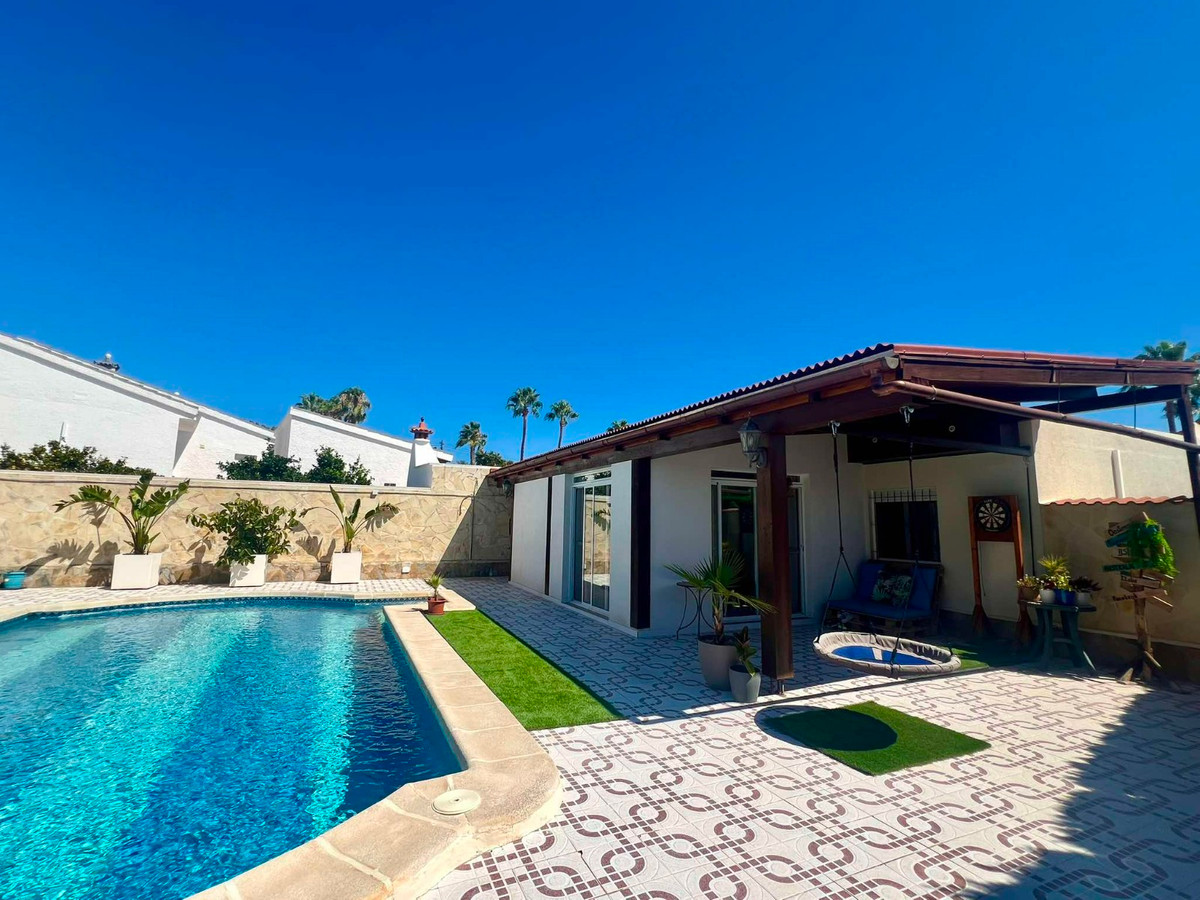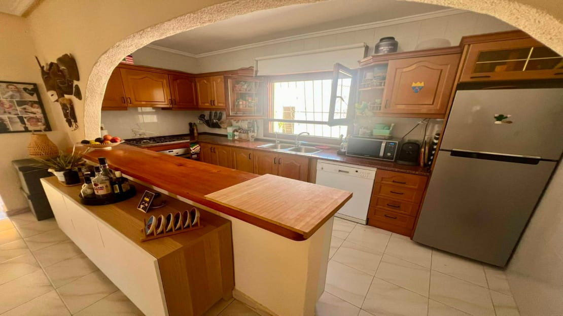 Beautiful finca style villa with guest house and private pool in the heart of Ciudad Quesada , walking distance to the main street yet very quiet.You enter the fully walled plot of 834 m2 with on the right side a separate garage of 36 m2 with high ceilings (ideal for a camper) and on the left side an integrated garage to the main house and also a storage room.The villa consists of a nice entrance with extra space that can be used as an office, then you have the living room with fireplace, an American kitchen, three bedrooms, the master with a dressing room and ensuite bathroom and another separate bathroom. At the back there is a veranda, recently glazed which provides extra living space with beautiful views of the private pool.In the garden there is a covered terrace with outdoor bar, which is ideal for relaxing. On the side of the house there is a staircase leading to the roof terrace, with beautiful views of the surroundings and the salt lakes. Under the stairs there is a laundry room. At the back of the garden you will find the recently modernized guest house , with a covered terrace , a living room ( also overlooking the pool) , a large kitchen , a storage room , a bathroom and a spacious bedroom with built-in closets. There is an outdoor shower and at the back of the casita also a built barbecue.The house is sold partly furnished, almost all rooms have air conditioning and fly screens.Only a few minutes walk to bars, restaurants, the aqua park. Ideally located because of the good connection to the motorway , 5 minutes drive to the golf, 20 minutes drive to the beautiful sandy beaches of Guardamar and La Mata, 30 minutes to Alicante airport and 50 minutes to Murcia airport.