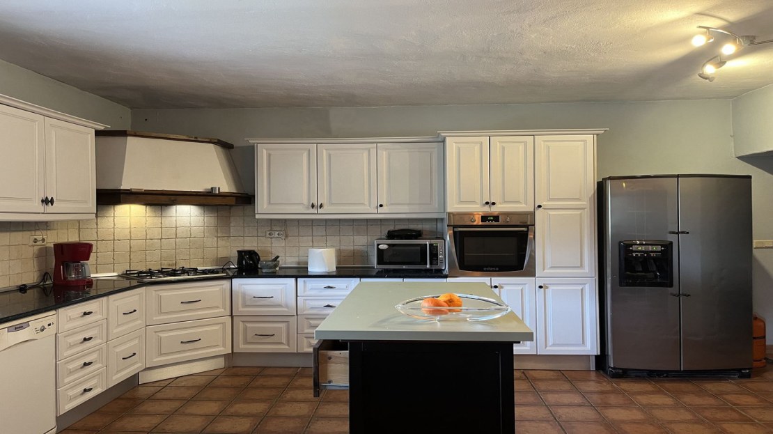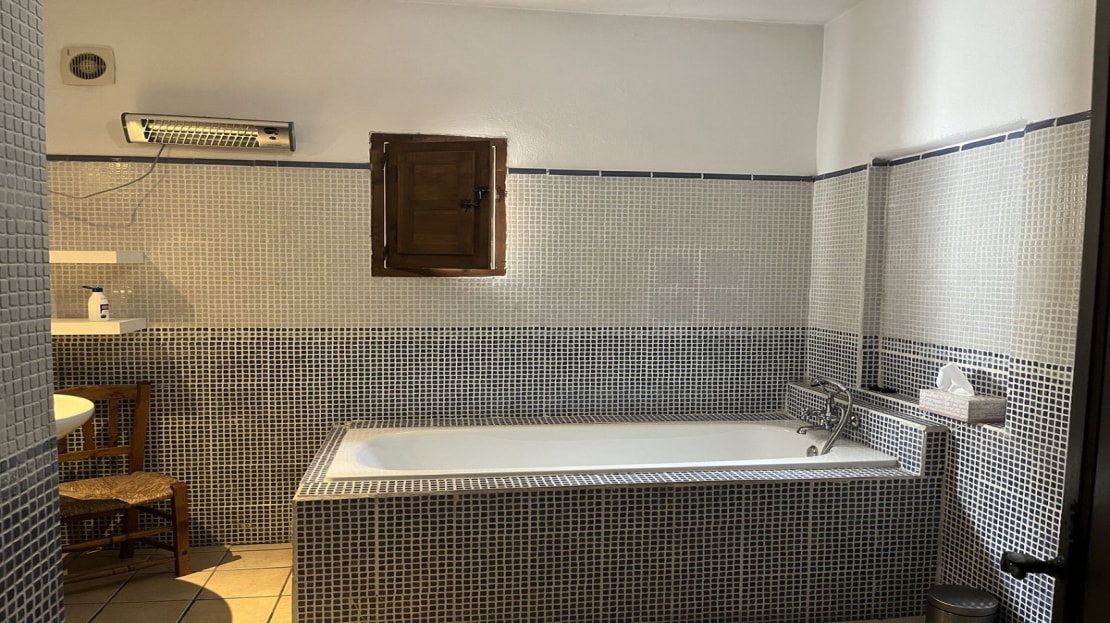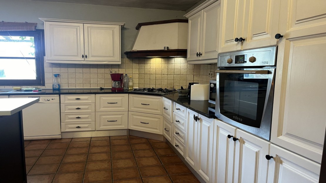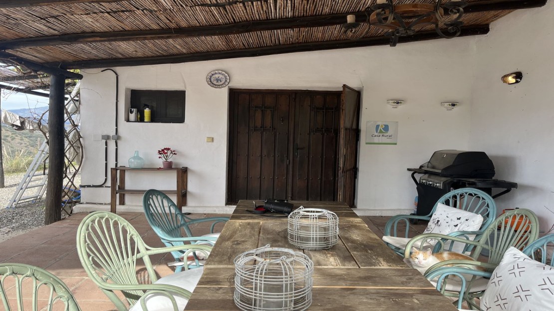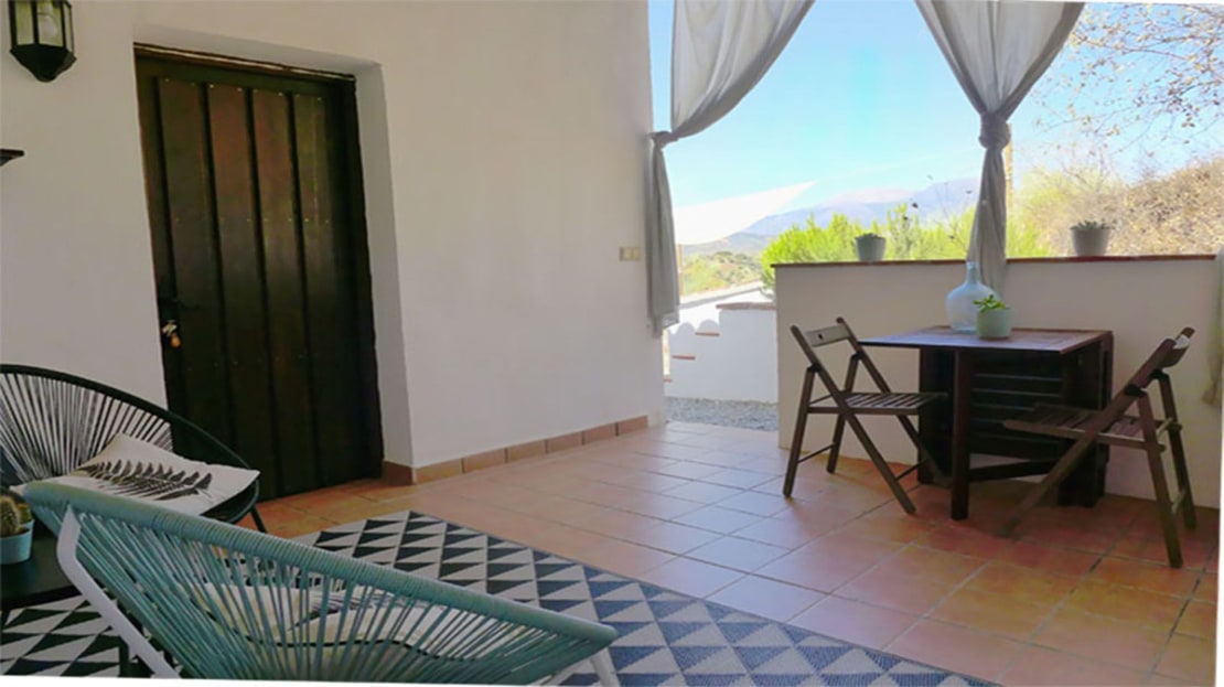 Inside, the house has four double bedrooms, three inside the main house and one outside with its own bathroom and terrace. The master bedroom has an ensuite bathroom and there is a second large family bathroom as well, with bath and shower. The open plan kitchen-dining-lounge area leads out onto the front and back covered terraces. The kitchen is fully fitted with fridge, freezer, oven and dishwasher and hand painted cupboards. The house is designed to keep cool during the hot summer months and the 12 x 5m open plan main room, including the kitchen, offers cool indoor space during the hottest part of the day. The front terrace is an ideal place for al fresco dining and enjoying the magnificent sunsets over the mountains in the distance.