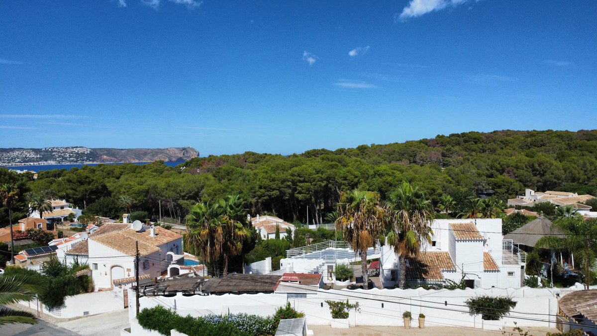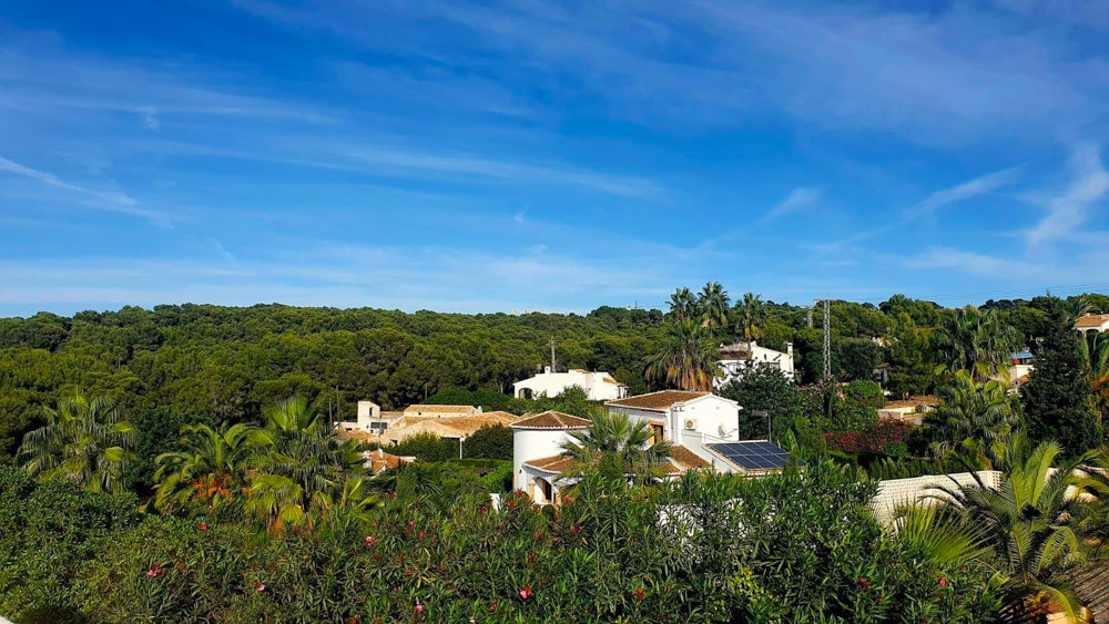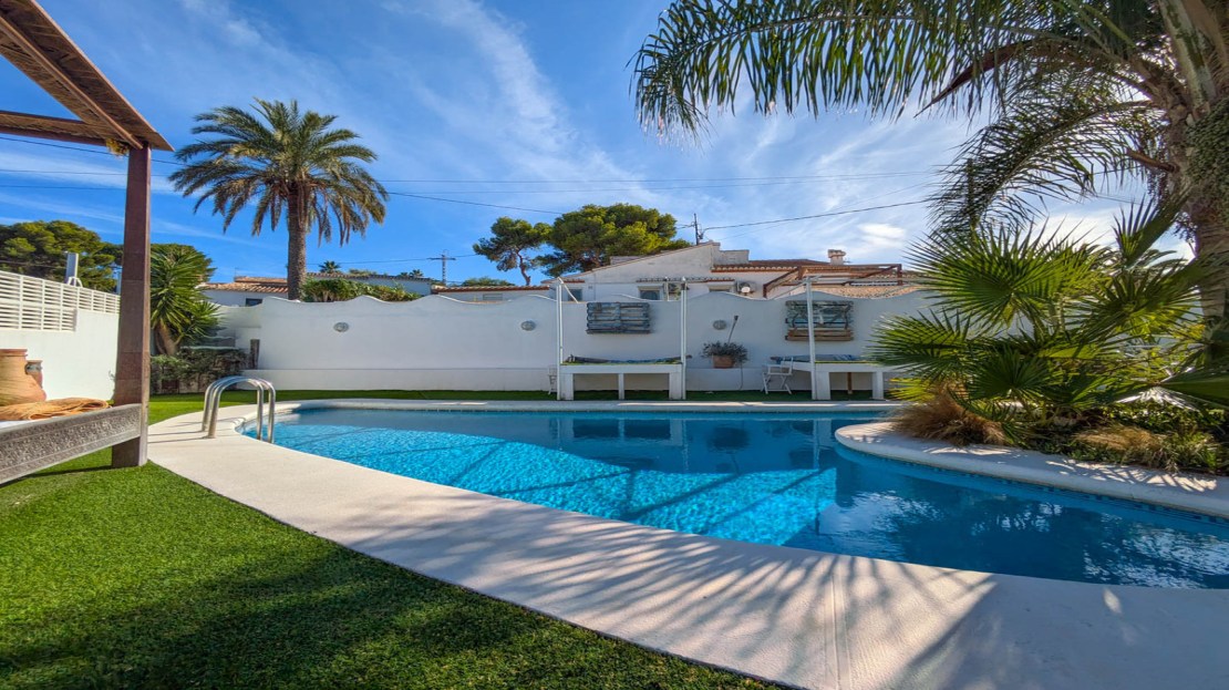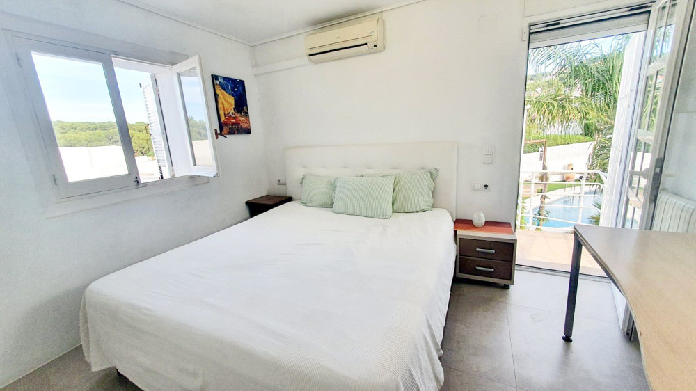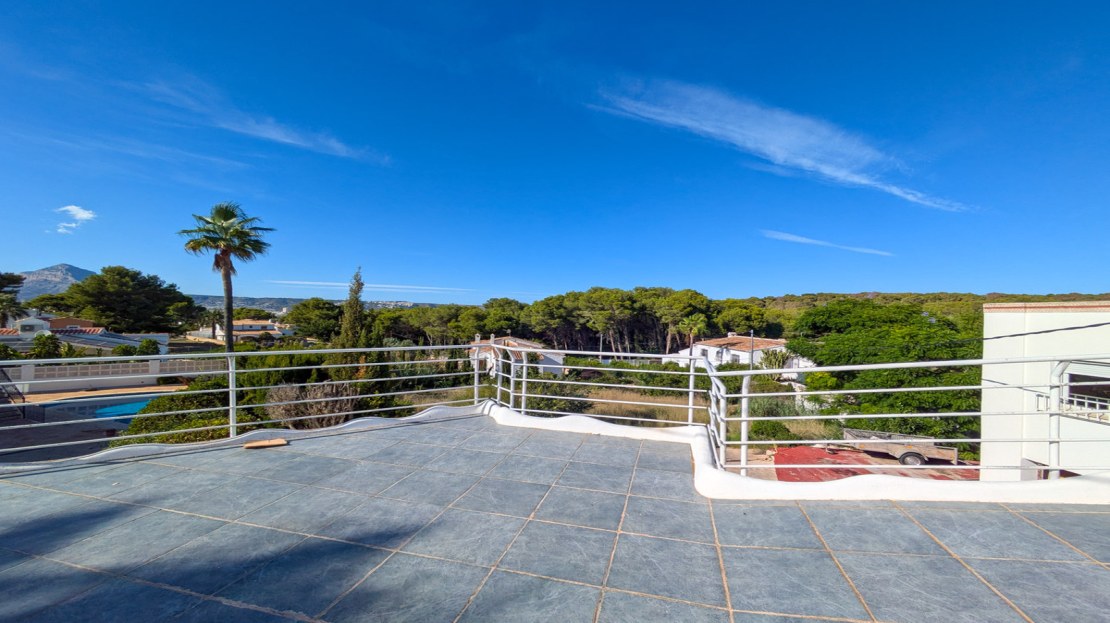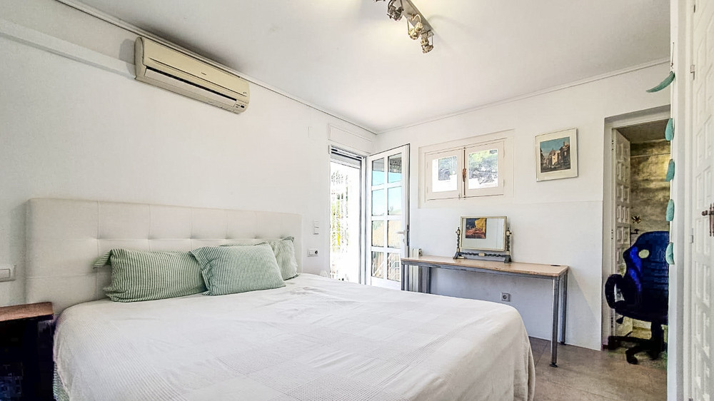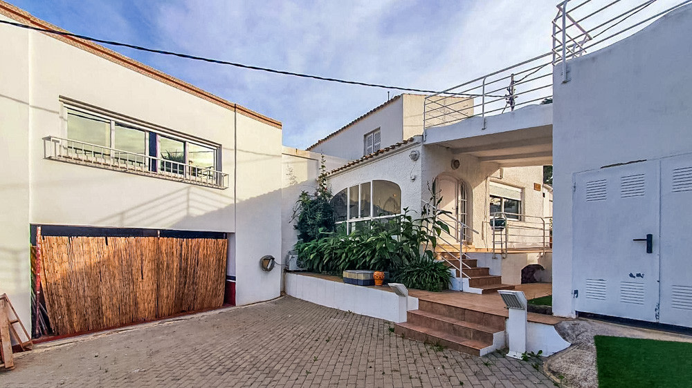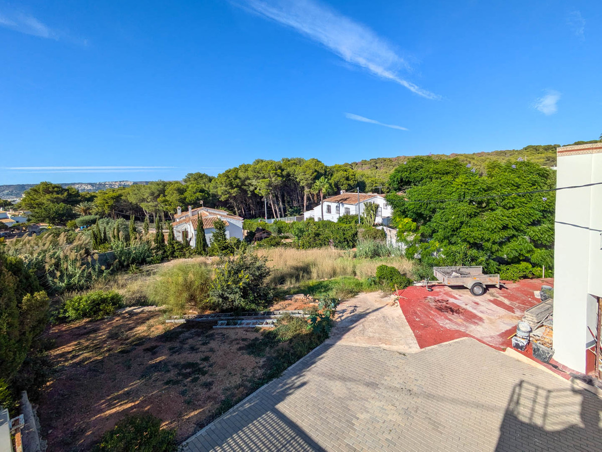 This villa is located in a quiet area less than a km from the idyllic beach of Cala Blanca and from the Xabia International College. The sandy beach ‘El Arenal’ where you will find several cosy bars and restaurants is only a 5-minute drive away. The property is located on a plot of as much as 1575 m2 of which the north side is still undeveloped. This gives it the possibility for a sports field, a mobile home for guests, a vegetable garden, etc. On the east side of the villa we find a private swimming pool with lounging area and a large Balinese pergola. On the south side is a barbecue area and a covered terrace. The house is divided over 2 floors. The ground floor consists of a spacious living-dining room with a fireplace, an independent kitchen, a double bedroom with an en suite bathroom, a second bedroom and a laundry room. The upper floor consists of another two double bedrooms with a shared bathroom. Adjacent to the property is a large double garage with a multi-purpose room above it directly connected to the house. There is the possibility to add another bathroom here to create a separate guest accommodation. The villa has radiators, 2 electric water heaters for hot water and air conditioning. The property is in need of renovation but offers great potential! Video on request.