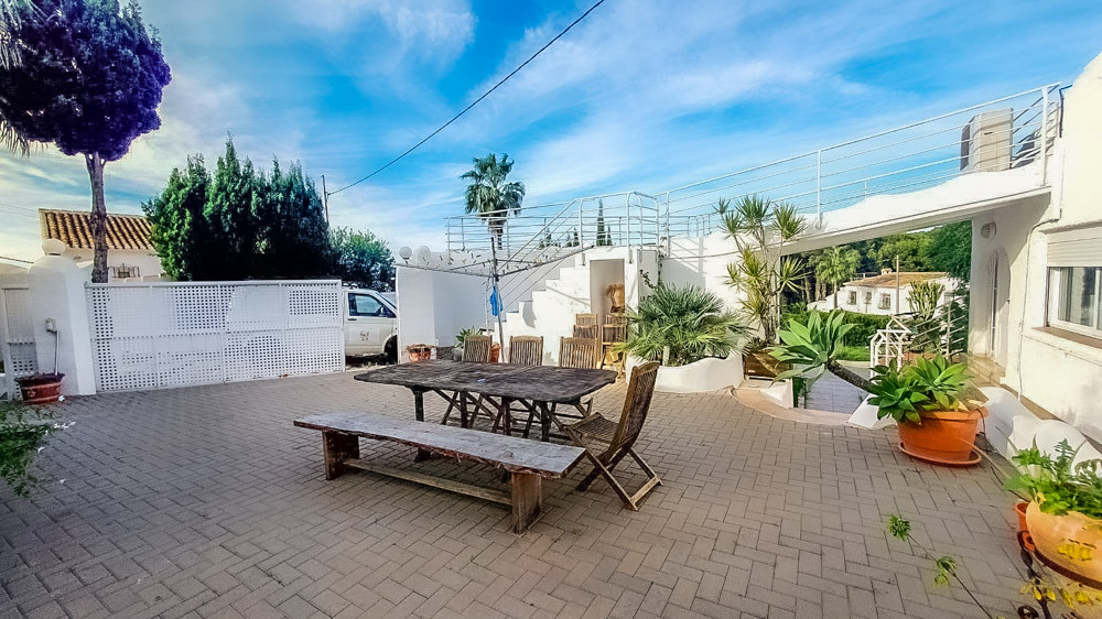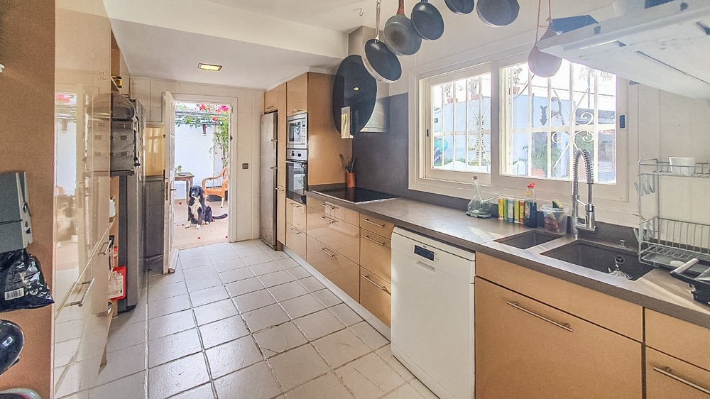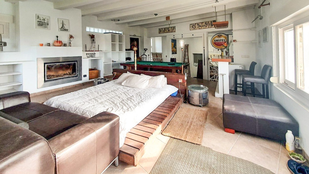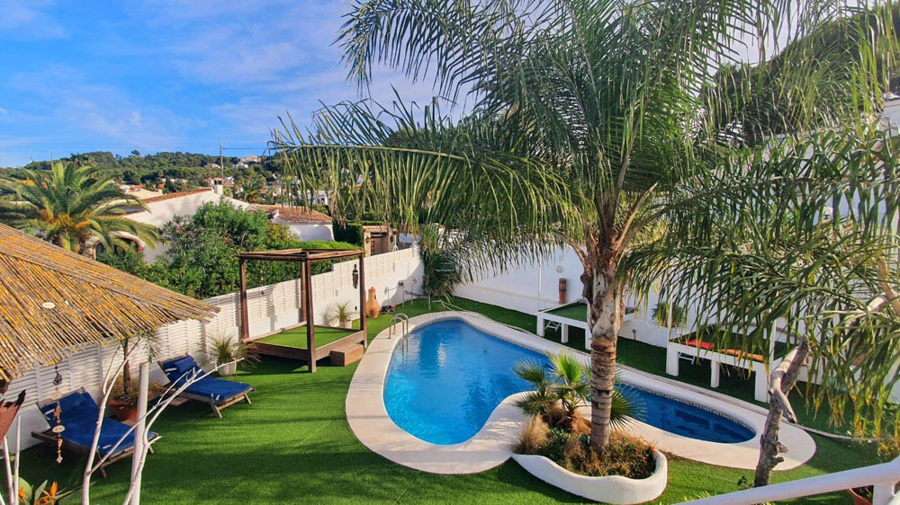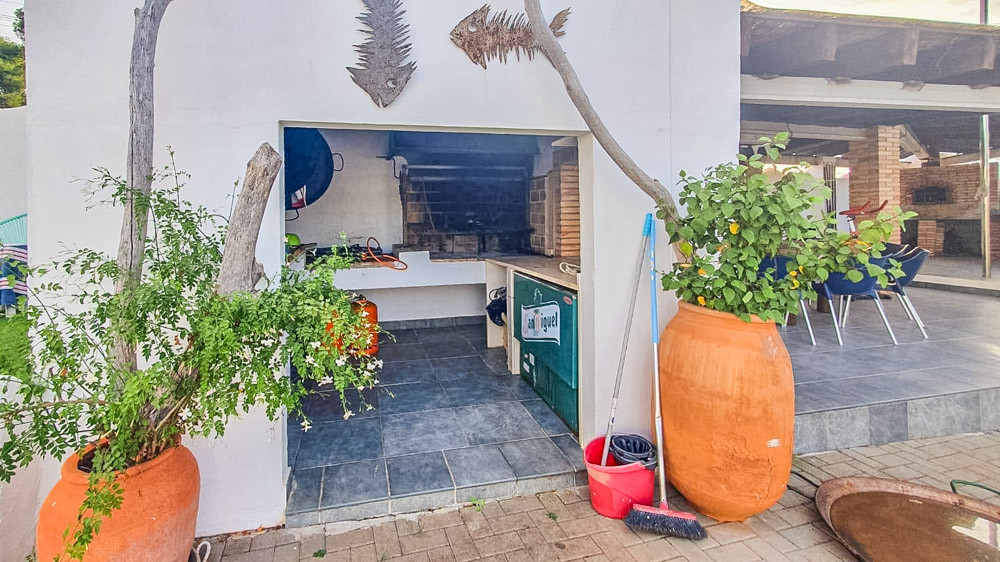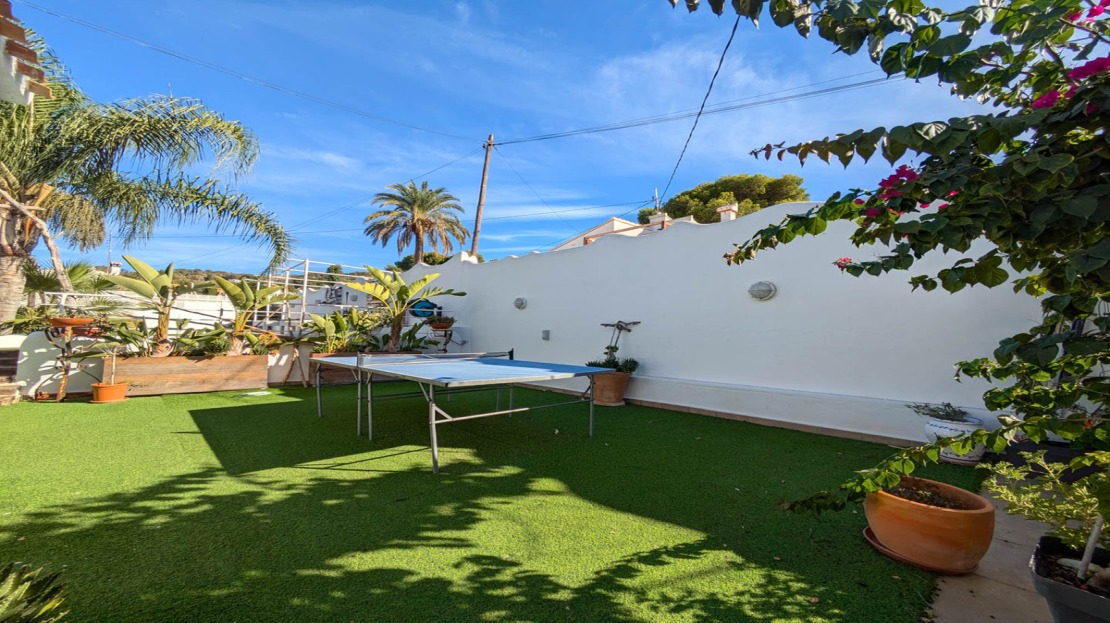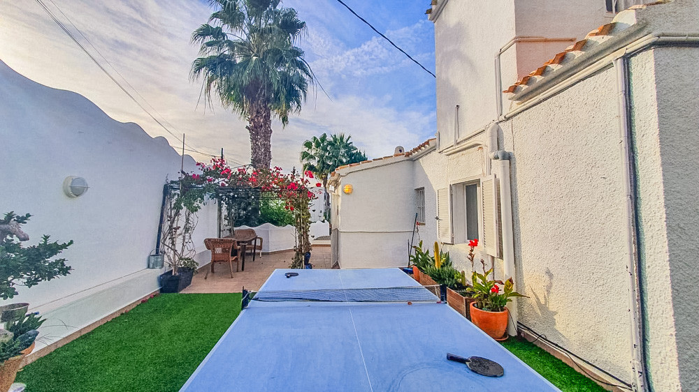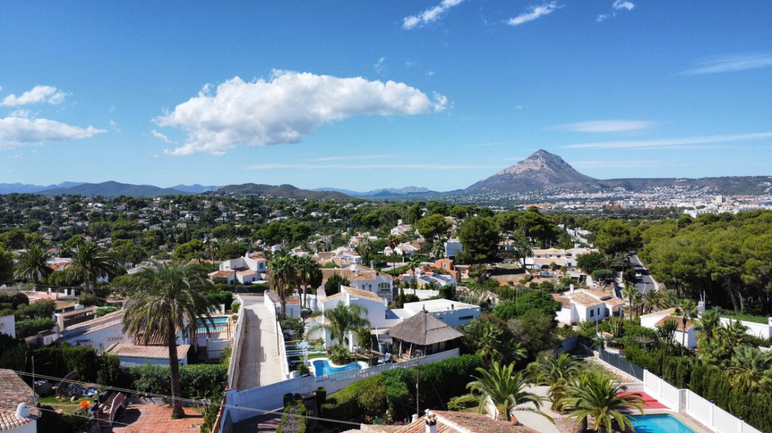 This villa is located in a quiet area less than a km from the idyllic beach of Cala Blanca and from the Xabia International College. The sandy beach ‘El Arenal’ where you will find several cosy bars and restaurants is only a 5-minute drive away. The property is located on a plot of as much as 1575 m2 of which the north side is still undeveloped. This gives it the possibility for a sports field, a mobile home for guests, a vegetable garden, etc. On the east side of the villa we find a private swimming pool with lounging area and a large Balinese pergola. On the south side is a barbecue area and a covered terrace. The house is divided over 2 floors. The ground floor consists of a spacious living-dining room with a fireplace, an independent kitchen, a double bedroom with an en suite bathroom, a second bedroom and a laundry room. The upper floor consists of another two double bedrooms with a shared bathroom. Adjacent to the property is a large double garage with a multi-purpose room above it directly connected to the house. There is the possibility to add another bathroom here to create a separate guest accommodation. The villa has radiators, 2 electric water heaters for hot water and air conditioning. The property is in need of renovation but offers great potential! Video on request.