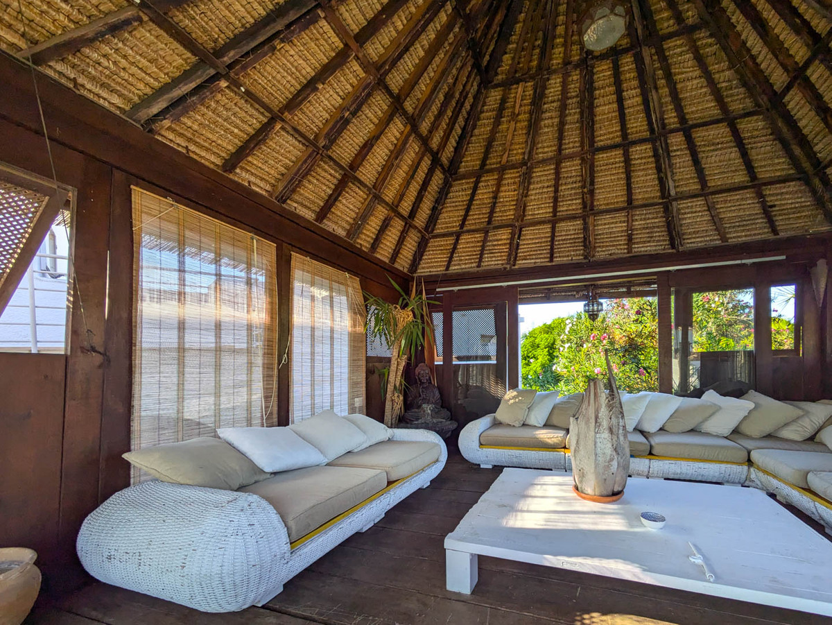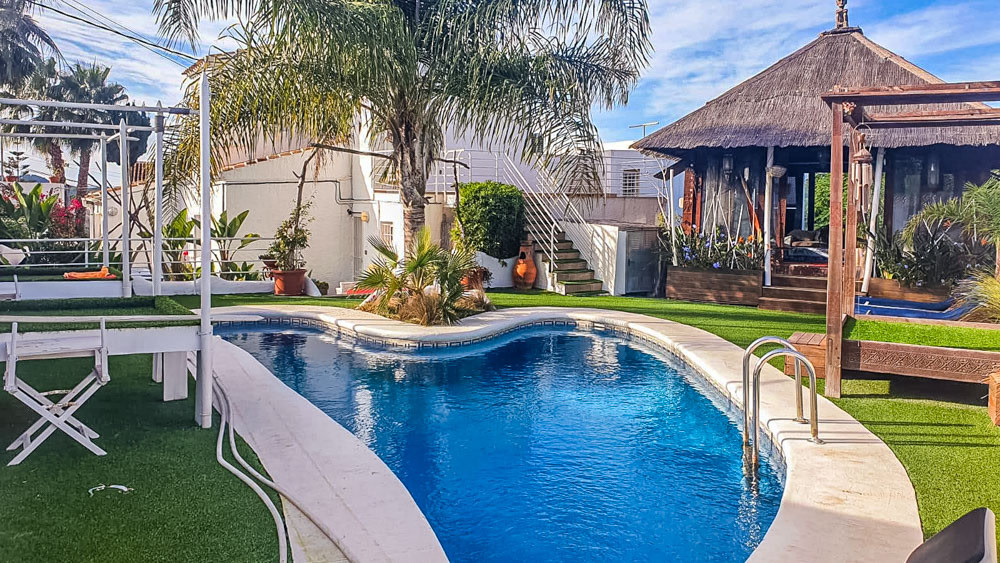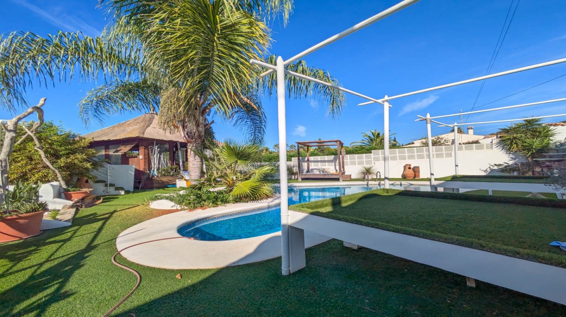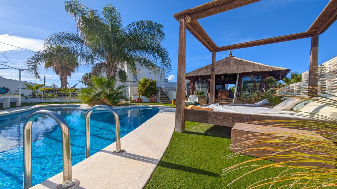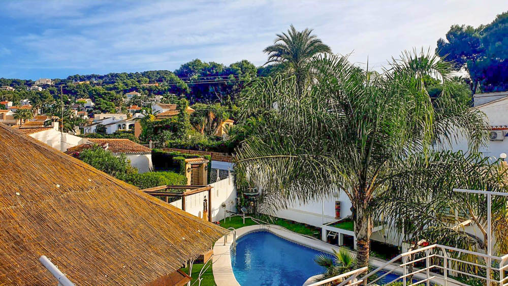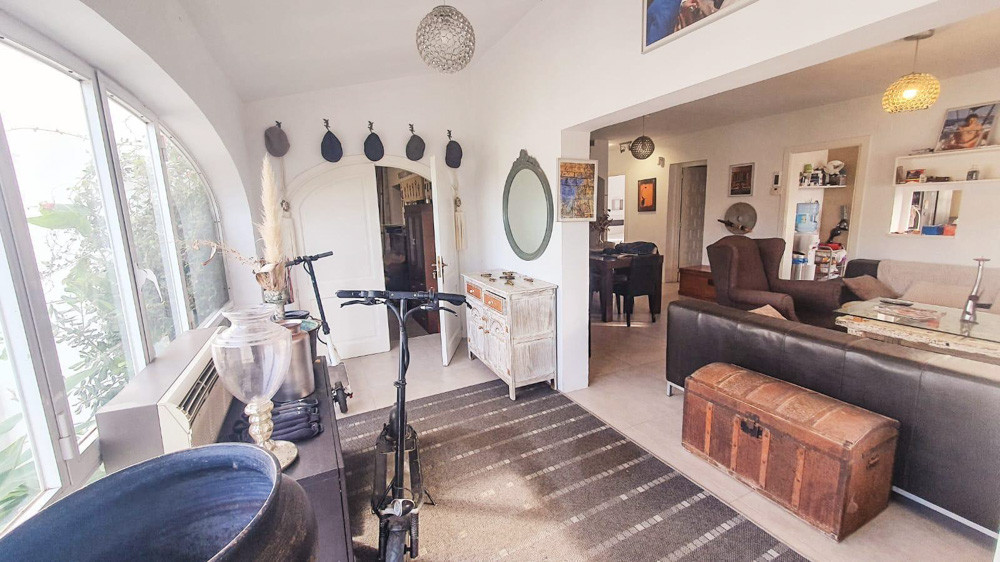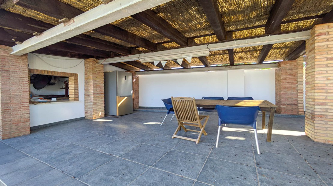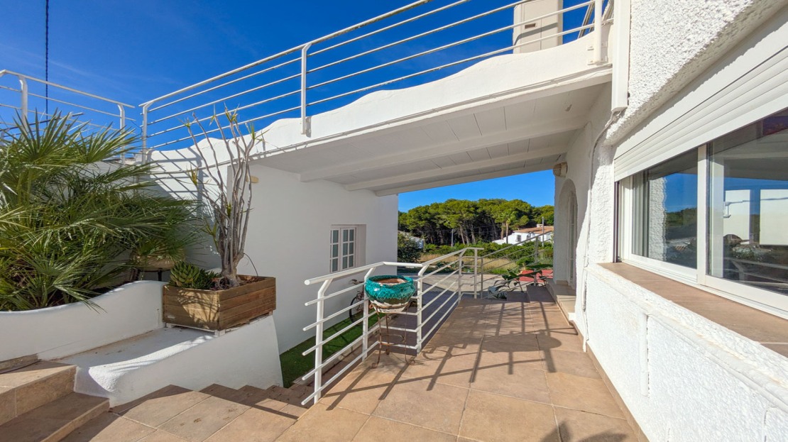 This villa is located in a quiet area less than a km from the idyllic beach of Cala Blanca and from the Xabia International College. The sandy beach ‘El Arenal’ where you will find several cosy bars and restaurants is only a 5-minute drive away. The property is located on a plot of as much as 1575 m2 of which the north side is still undeveloped. This gives it the possibility for a sports field, a mobile home for guests, a vegetable garden, etc. On the east side of the villa we find a private swimming pool with lounging area and a large Balinese pergola. On the south side is a barbecue area and a covered terrace. The house is divided over 2 floors. The ground floor consists of a spacious living-dining room with a fireplace, an independent kitchen, a double bedroom with an en suite bathroom, a second bedroom and a laundry room. The upper floor consists of another two double bedrooms with a shared bathroom. Adjacent to the property is a large double garage with a multi-purpose room above it directly connected to the house. There is the possibility to add another bathroom here to create a separate guest accommodation. The villa has radiators, 2 electric water heaters for hot water and air conditioning. The property is in need of renovation but offers great potential! Video on request.