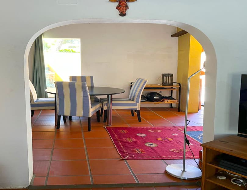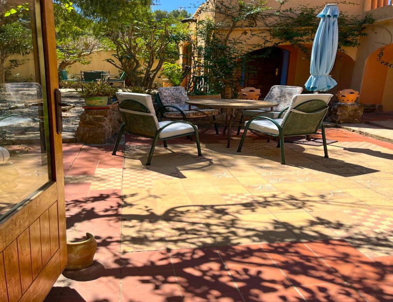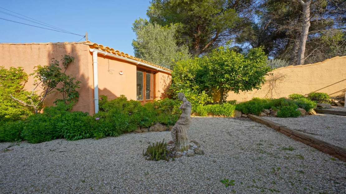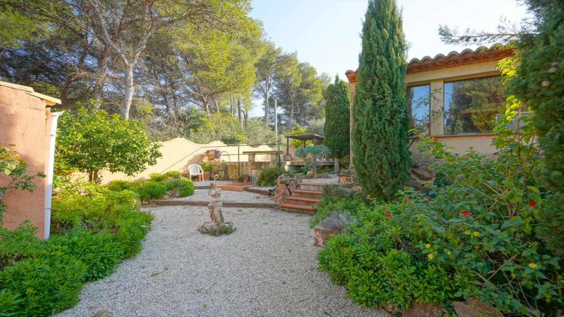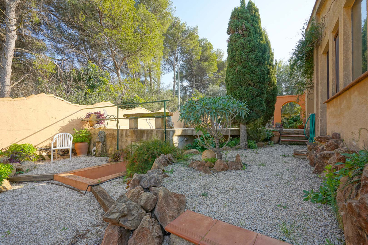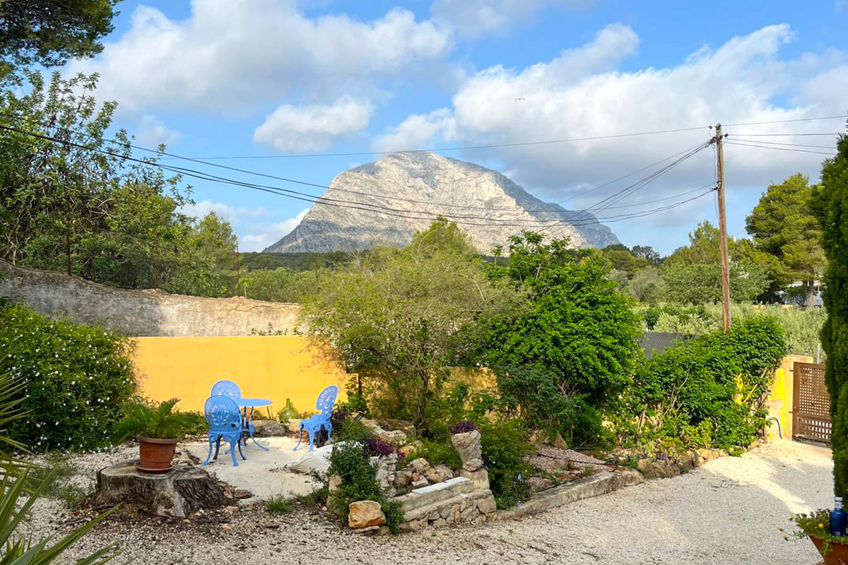 This villa is ideal for people who are looking for a quiet and peaceful environment, but still want to be a short distance from facilities. Due to its location in the Montgó Natural Park, you are in a very quiet area just a 5-minute drive from both Javea and Denia. The house consists of a lounge with large windows where you can enjoy the beautiful views of the Montgó, a living room with a fireplace, a dining room, a kitchen with a gas stove and an electric oven, a laundry room, two bedrooms, both with dressing rooms and mirrored wardrobes and a bathroom. The dining room gives access to a patio where there is a third bedroom. From the patio there is also a staircase that leads to the roof terrace. At the back of the villa is a guest apartment consisting of a living-dining room, a kitchen, a double bedroom and a bathroom. The apartment has a private entrance and private terrace, ideal for family or guests. There is also a garage with an adjacent workshop (which can be converted into a 5th bedroom) and a carport with space for two cars. On the east side of the villa is a 9×5 swimming pool with a surrounding terrace and a large covered dining area with seating for 10 around a Moroccan mosaic-tiled table. Gravel paths wind to the far corner of the plot where there is a fish pond and a bench. The villa has air conditioning in the master bedroom, gas heating, double glazing, an insulated roof, terracota floors, an electric gate and exterior lighting. Moreover, the entire plot is fenced. For hiking enthusiasts, hiking trails through the forest leave right from the villa leading to the nature reserve and to a viewpoint from where you can overlook the entire bay of Jávea. The entire plot is fenced and on the east side of the villa you look out onto a dense forest which guarantees complete privacy by the pool. A true paradise for nature lovers!