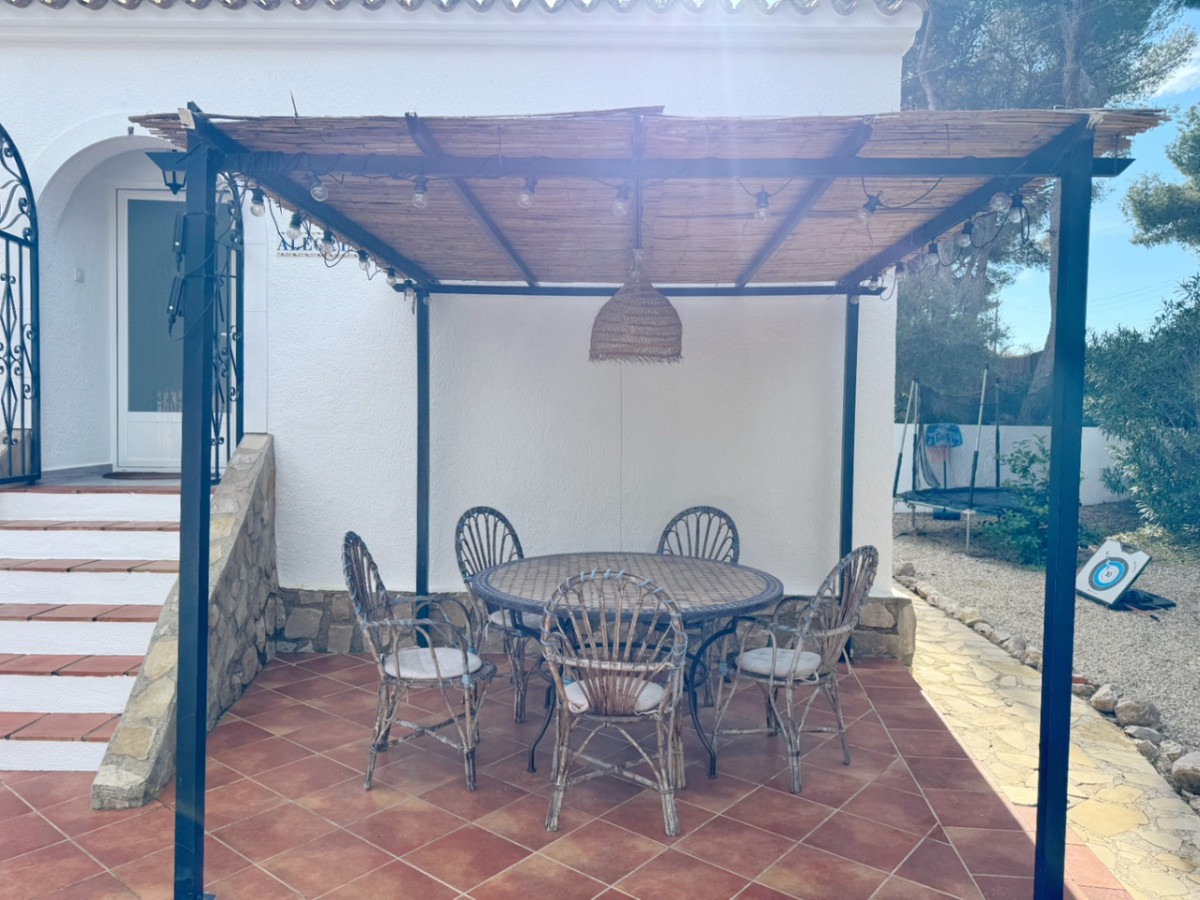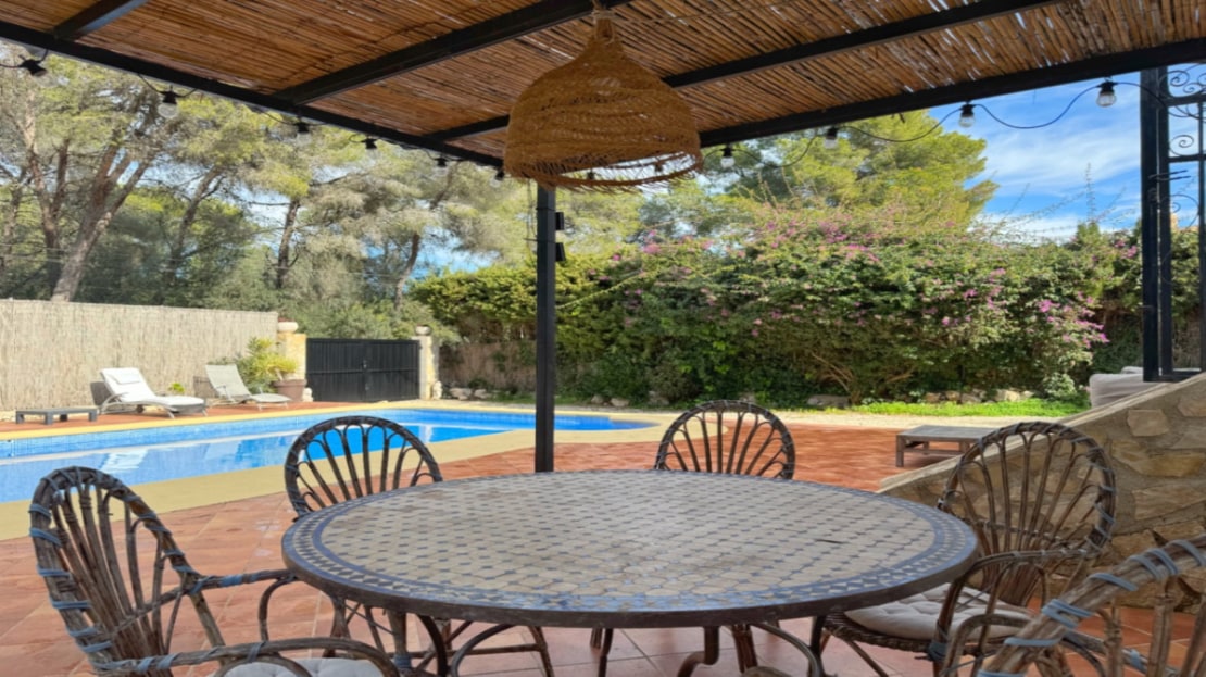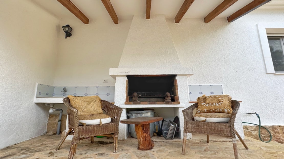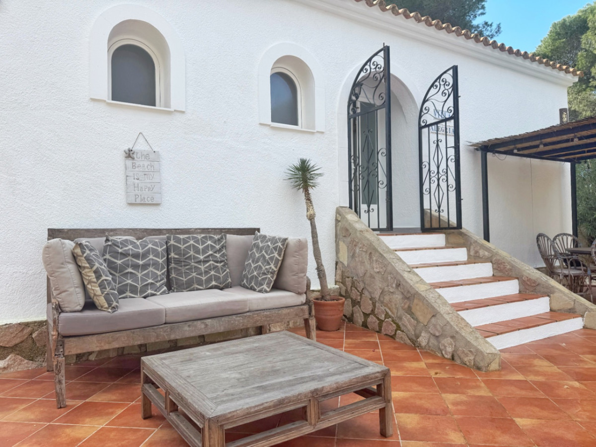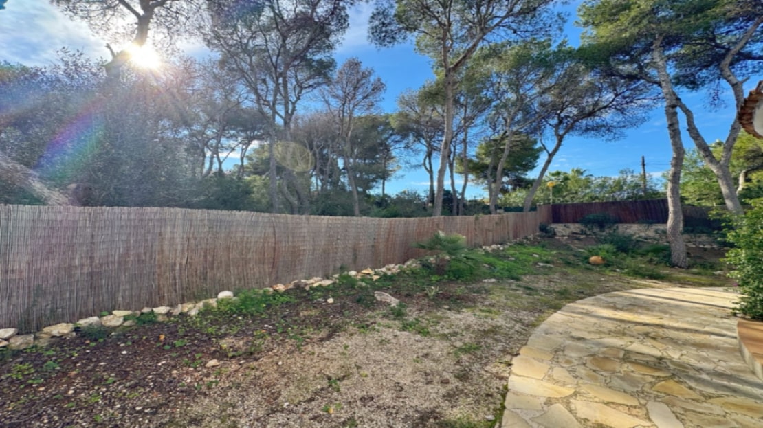La Naya Real Estate presents this renovated villa, offering plenty of privacy, tranquility, and security. It is fully fenced, and across from the property, there is a green area with a small forest. The total plot covers 730 m² and is completely enclosed to ensure maximum privacy. The house has 4 bedrooms: one with a double bed, another with 2 single beds, and a children's room. There are 2 bathrooms (one en suite and another with a shower and bathtub) as well as a separate guest toilet. The living room features a fireplace and a cozy sitting area. The covered, glass-enclosed terrace (Naya) offers views of the garden. The open kitchen with an island is fully equipped. Outside, there is a saltwater pool with an outdoor shower, a waterproof pergola, a BBQ area, a chillout zone, and a children's play area. The main beach, Arenal, is just 15 minutes away.