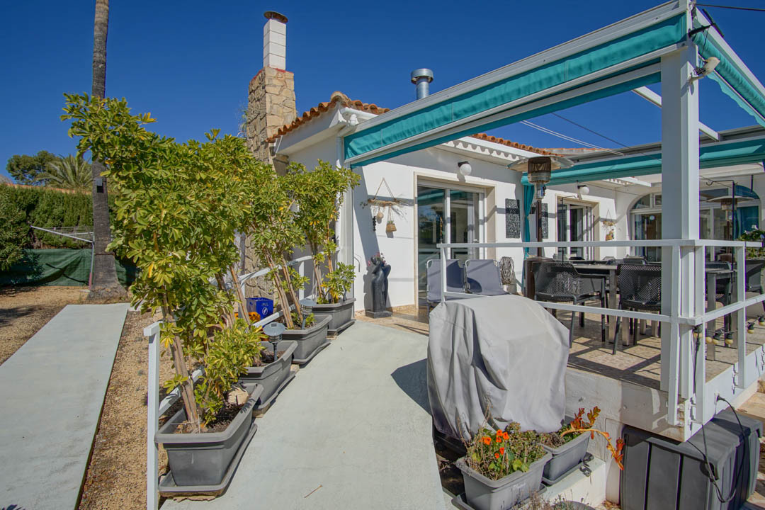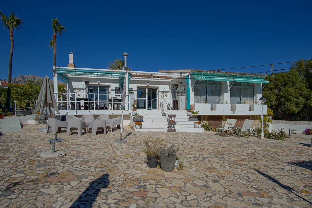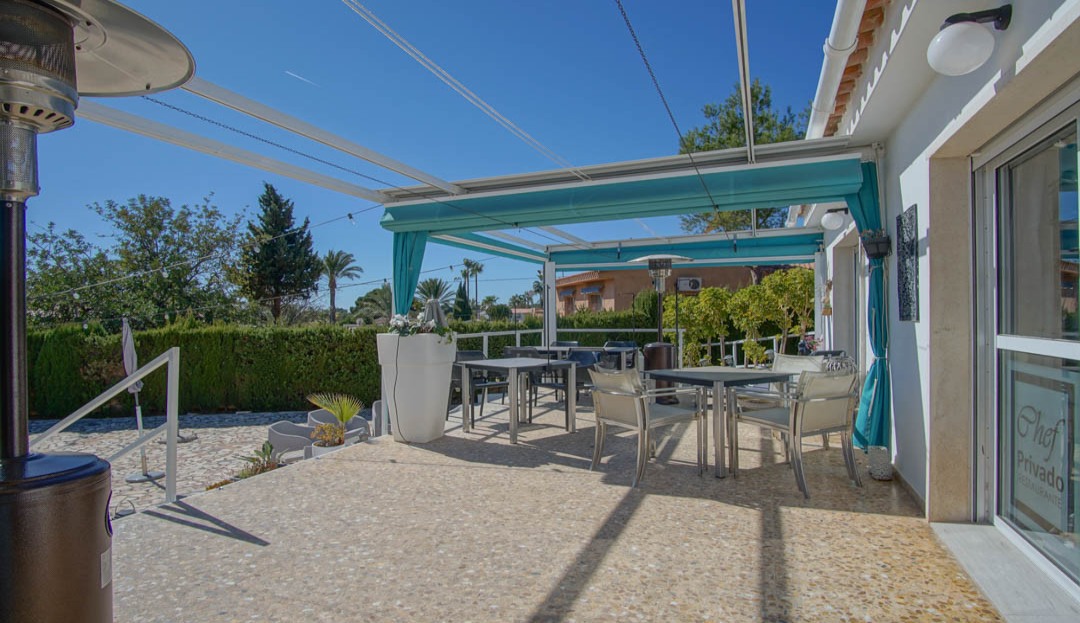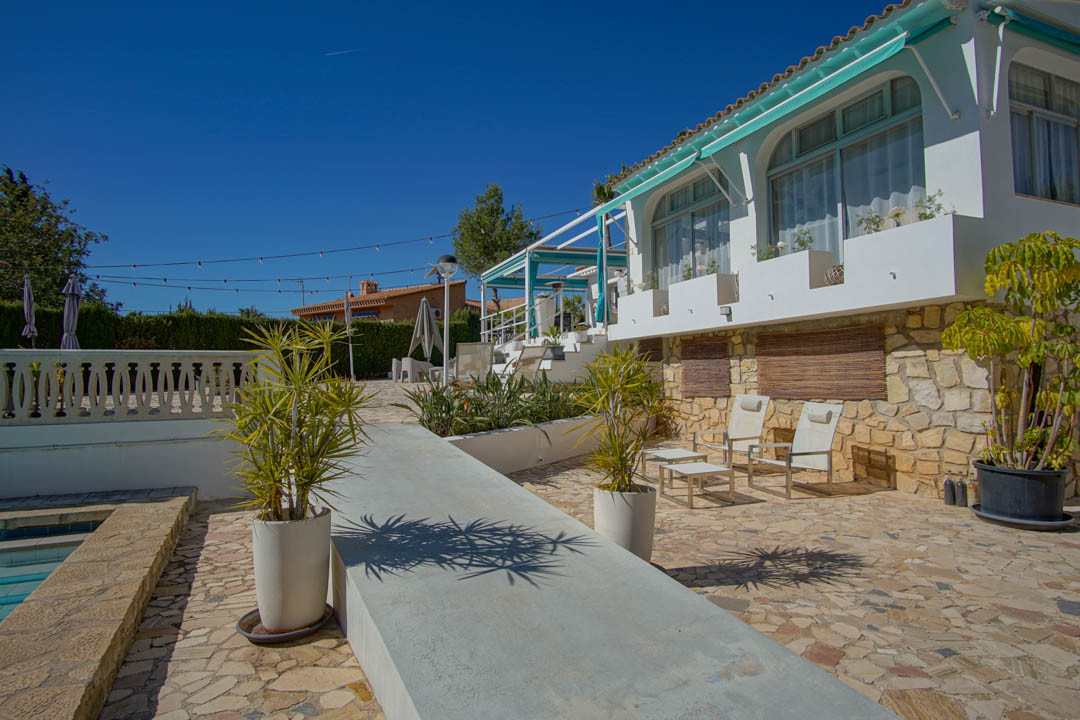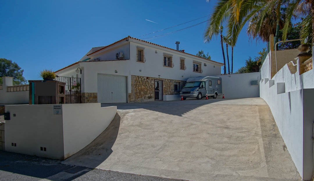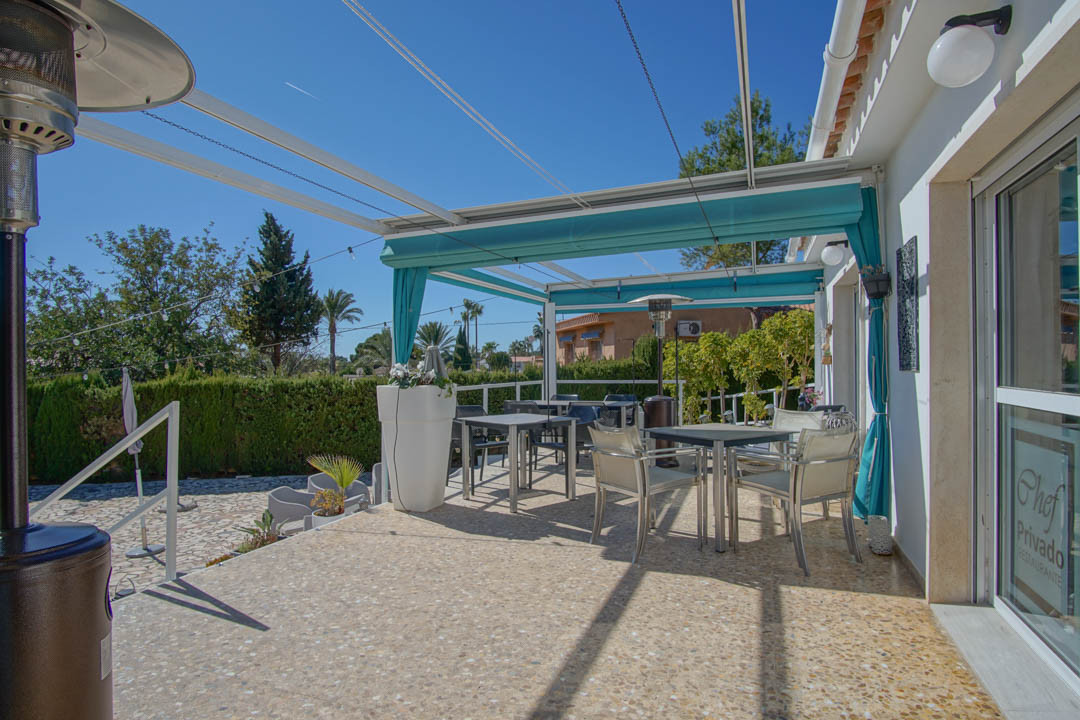 This traditional Spanish villa is south oriented, 230m2 built in 1975, on a plot of 1087m2 and consists of two floors with independent entrances, on the first floor there is a large professional kitchen, with utility room, a large living room with access to a large terrace, a large bedroom with an ensuite bathroom overflowing to a large veranda which now partly serves as an office and lounge. Although the villa has been adapted for private parties or private dinners for up to 25 people the villa can be returned to its original state. Downstairs there is a guest house two entrances, consisting of a bedroom, a kitchen and a living room and at the back a bedroom which now serves as storage. There is also a garage for 1 car with storage and a technical room also with storage. The large garden has several terraces and a large pool of 5m x 10m On the street side there is parking for about 6 cars. The villa is completely wheelchair friendly and within walking distance to stores and restaurants.