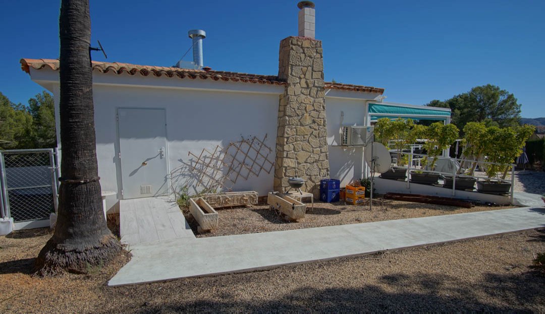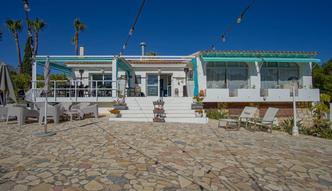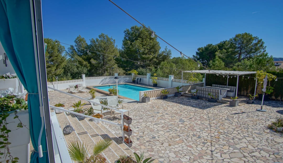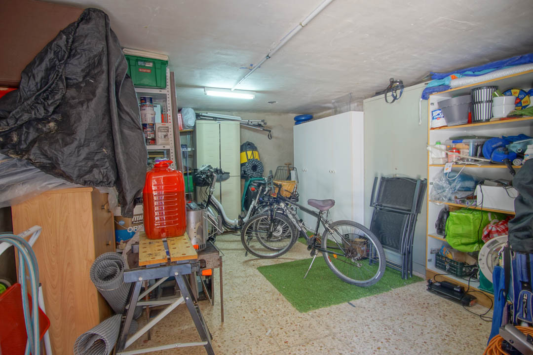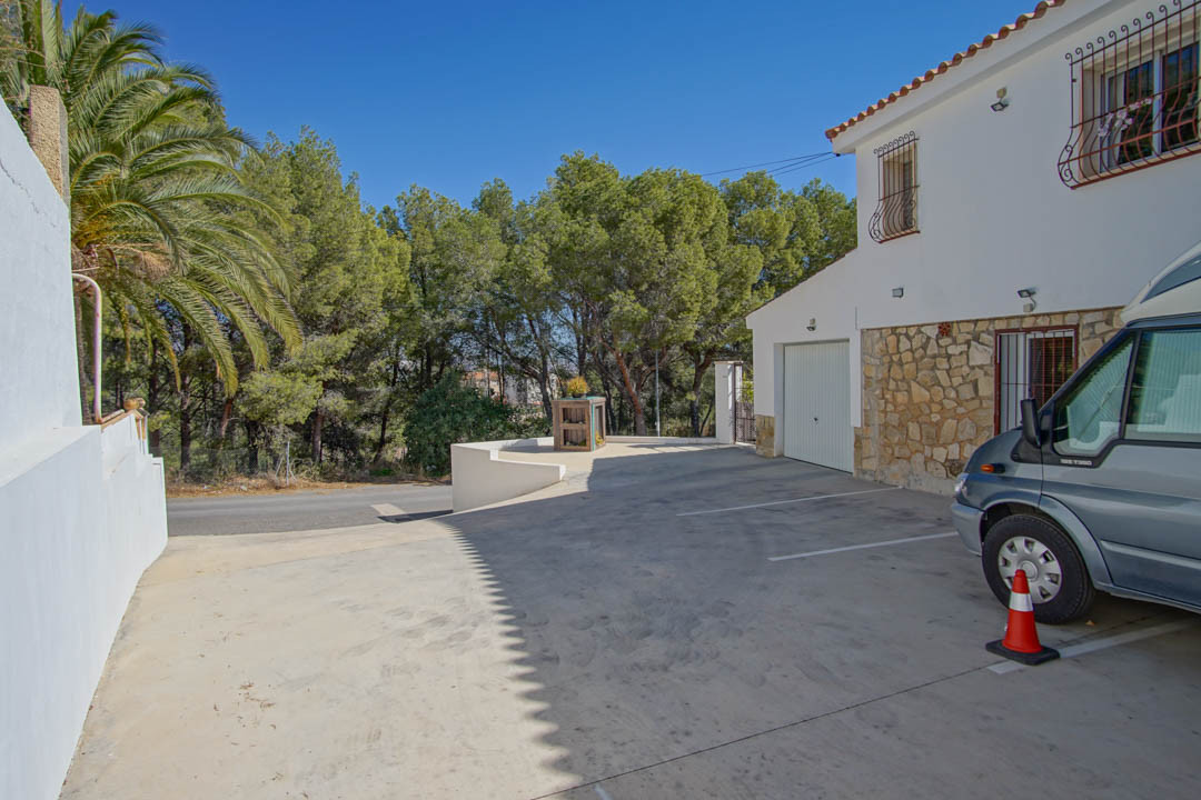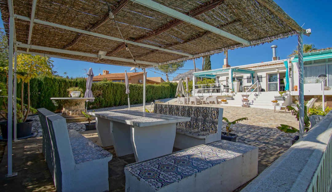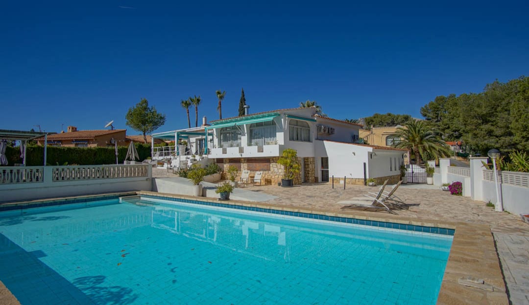 This traditional Spanish villa is south oriented, 230m2 built in 1975, on a plot of 1087m2 and consists of two floors with independent entrances, on the first floor there is a large professional kitchen, with utility room, a large living room with access to a large terrace, a large bedroom with an ensuite bathroom overflowing to a large veranda which now partly serves as an office and lounge. Although the villa has been adapted for private parties or private dinners for up to 25 people the villa can be returned to its original state. Downstairs there is a guest house two entrances, consisting of a bedroom, a kitchen and a living room and at the back a bedroom which now serves as storage. There is also a garage for 1 car with storage and a technical room also with storage. The large garden has several terraces and a large pool of 5m x 10m On the street side there is parking for about 6 cars. The villa is completely wheelchair friendly and within walking distance to stores and restaurants.