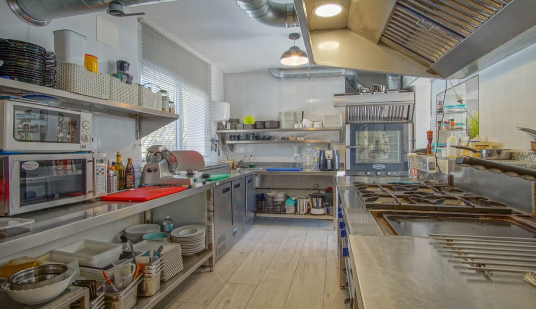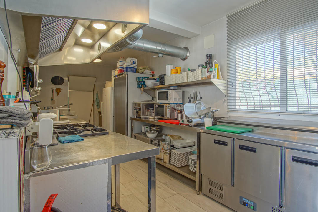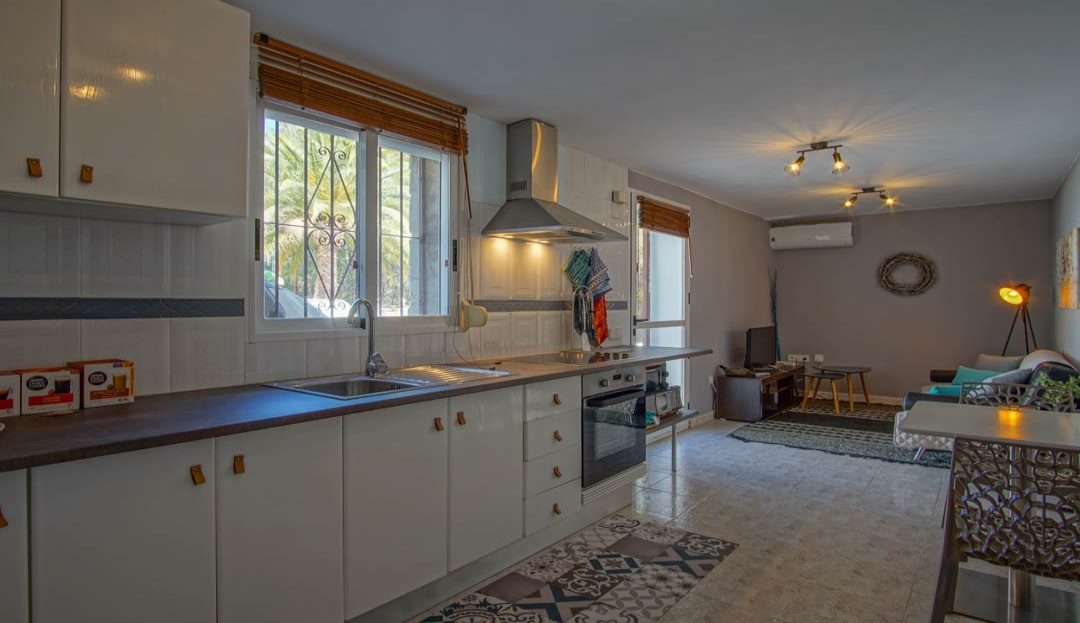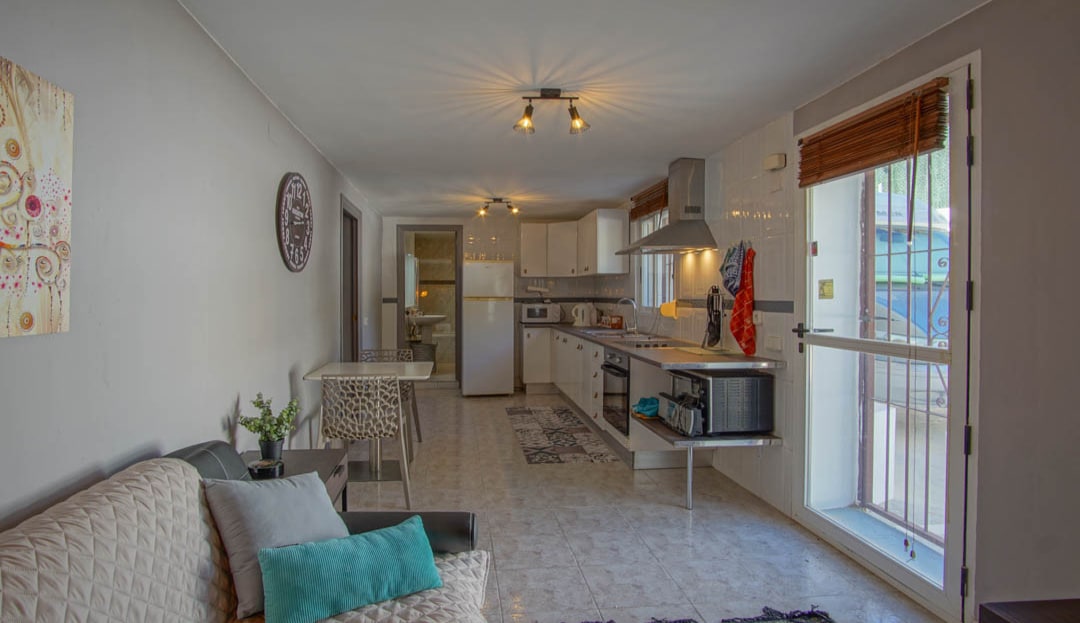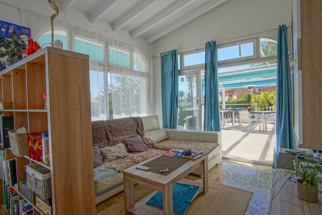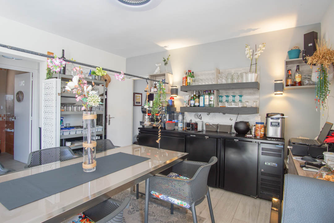 This traditional Spanish villa is south oriented, 230m2 built in 1975, on a plot of 1087m2 and consists of two floors with independent entrances, on the first floor there is a large professional kitchen, with utility room, a large living room with access to a large terrace, a large bedroom with an ensuite bathroom overflowing to a large veranda which now partly serves as an office and lounge. Although the villa has been adapted for private parties or private dinners for up to 25 people the villa can be returned to its original state. Downstairs there is a guest house two entrances, consisting of a bedroom, a kitchen and a living room and at the back a bedroom which now serves as storage. There is also a garage for 1 car with storage and a technical room also with storage. The large garden has several terraces and a large pool of 5m x 10m On the street side there is parking for about 6 cars. The villa is completely wheelchair friendly and within walking distance to stores and restaurants.
