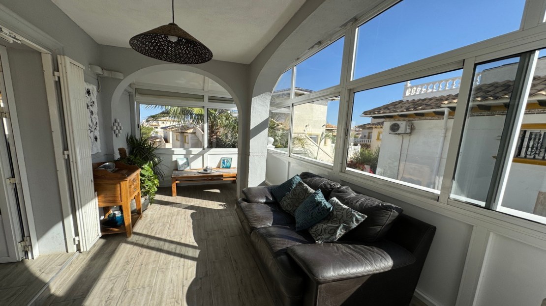 The top floor offers 2 bedrooms which share a bathroom with the master bedroom having extra space linked to a glazed in terrace. A staircase takes you to the solarium offering distance sea views.