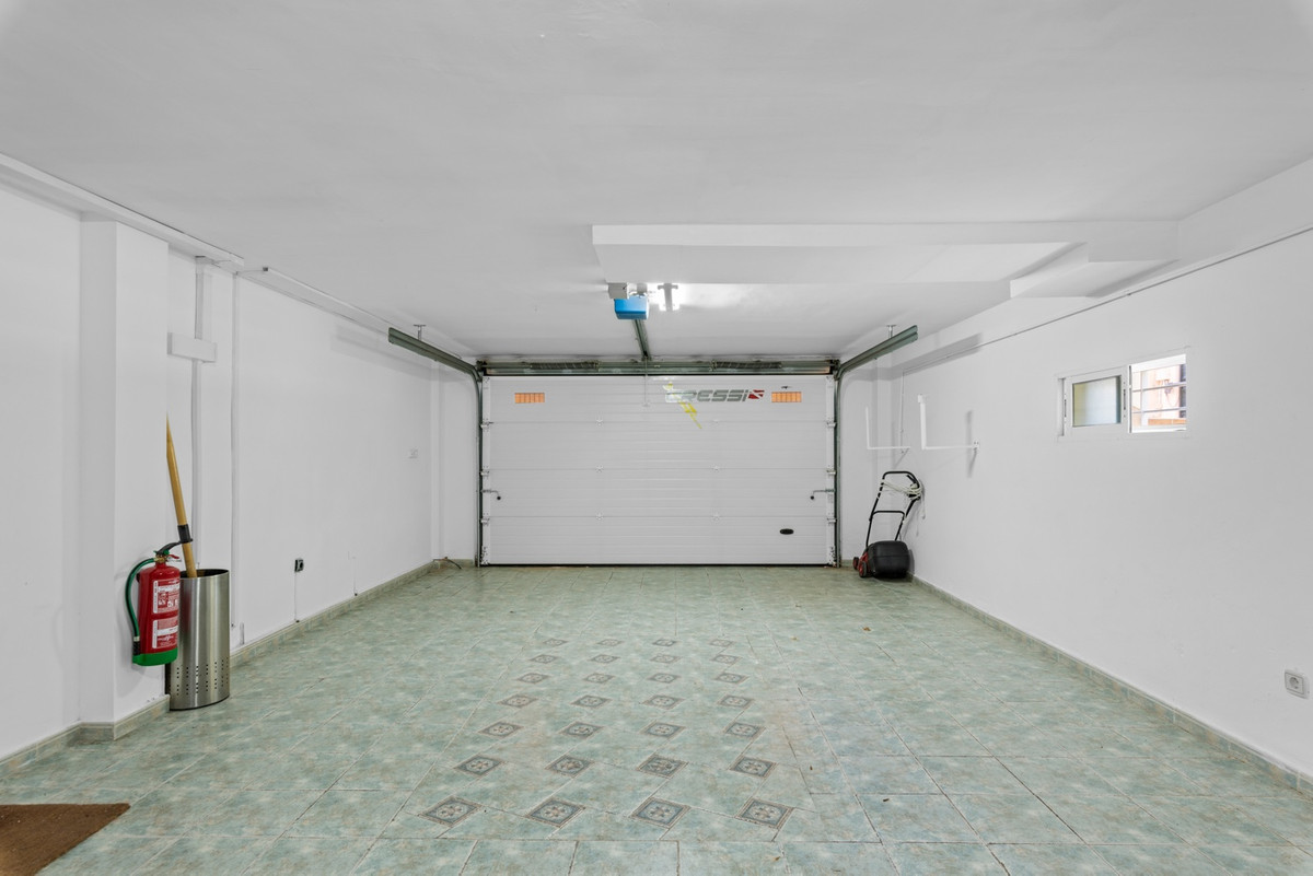 The exterior includes an 80 m² terrace, private pool, and garden, offering space for outdoor activities. The property also has private parking for three vehicles, a garage, and a storage room.