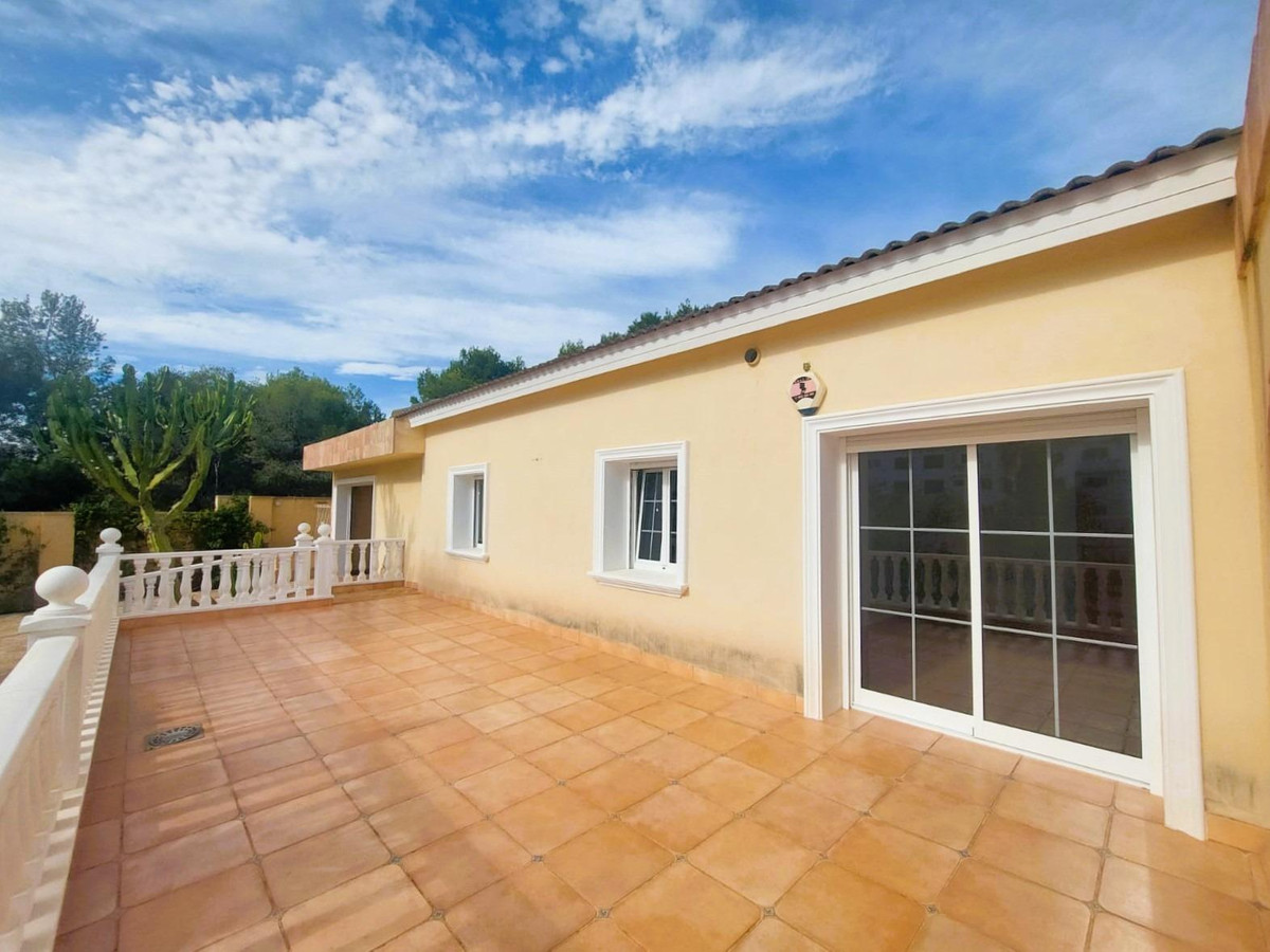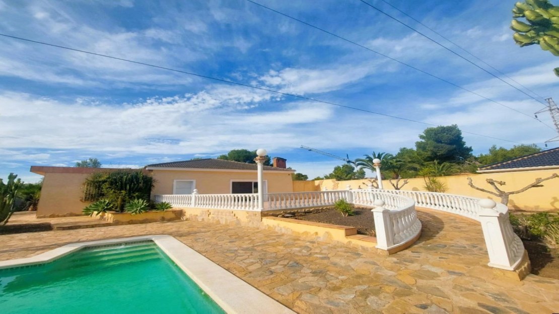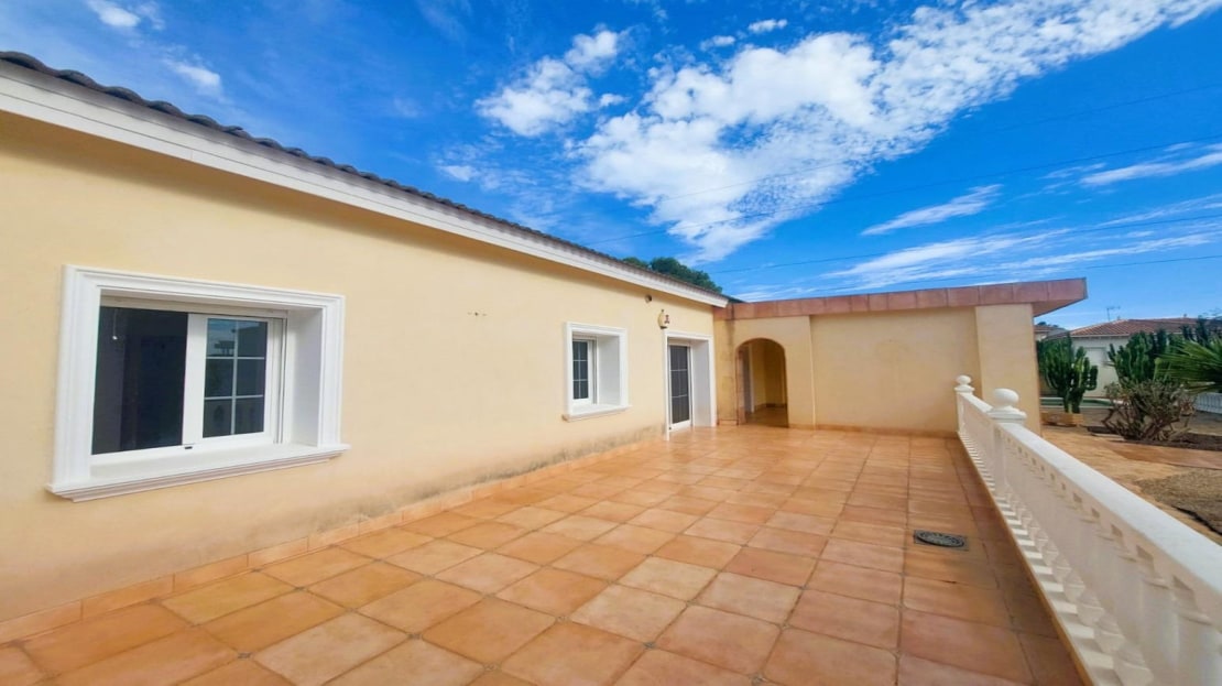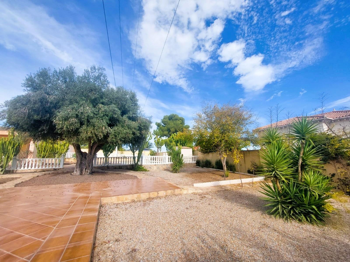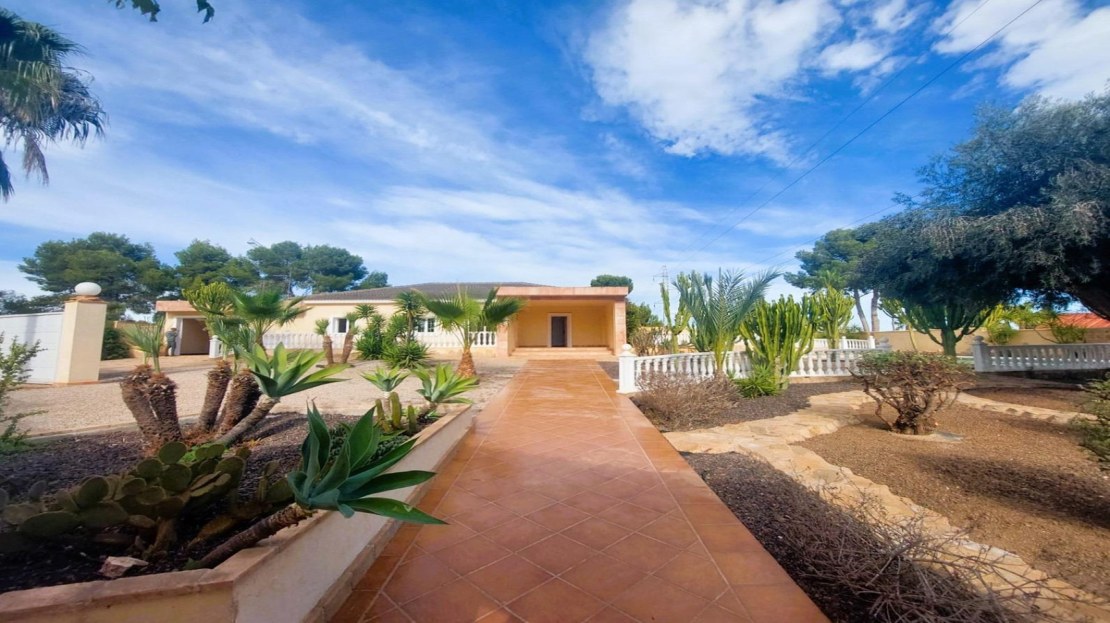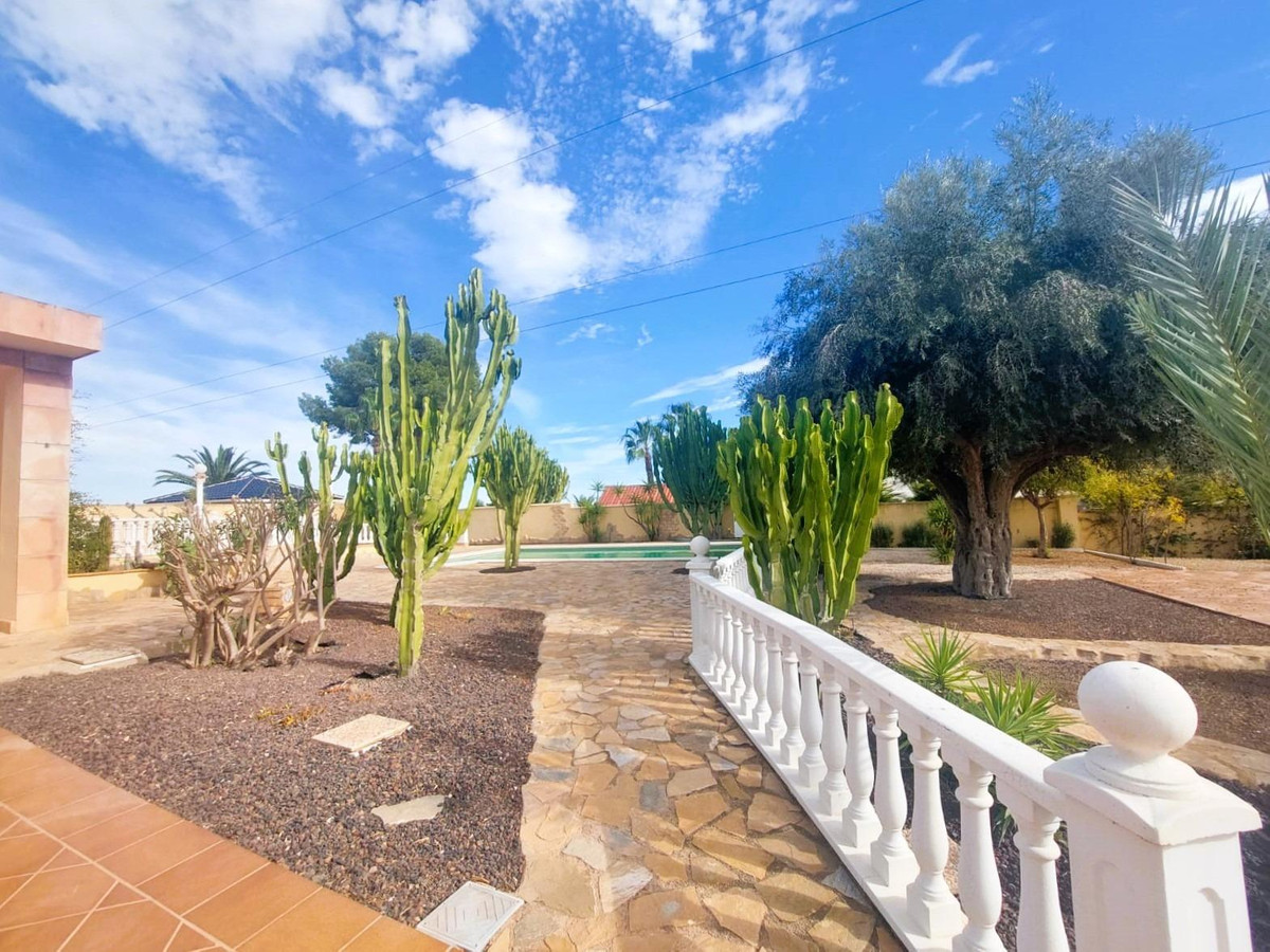 Spacious and bright detached villa with a beautiful garden of almost 1.500m2. Built and refurbished to the highest standards and fully legalised.. . There is a lot to tell about this spectacular villa:. – 296m2 built on 1 floor. – Southeast facing. – Lovely large swimming pool. – 2 huge terraces facing south and east respectively. – Very well kept garden with a variety of dry land plants. – 4 large double bedrooms. – 2 bathrooms, 1 en-suite. – Living-dining area and separate kitchen. – Spacious inner courtyard with kitchen area. – Large closed garage with space for several vehicles and laundry area. Automatic access. – Oil heating system with radiators in all rooms.. – Fantastic insulation: floor and wall chambers. High quality doors and windows. – Automatic blinds on the larger windows/doors. – Fireplace in the living/dining room. – Handmade terracotta floor . – Security door. – Well that collects water from the roofs via sewage system. Ideal for watering the extensive garden with irrigation system.. – Possibility to extend the house, on one of the large terraces, as it has been cemented and built with reinforced beams.. – Located at the end of a cul-de-sac, so it is very quiet..