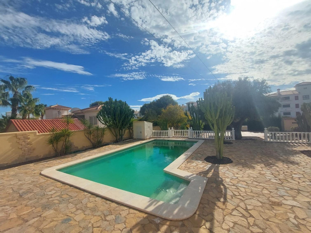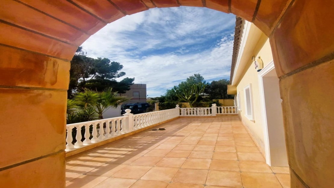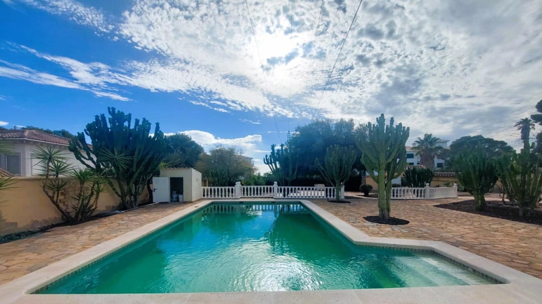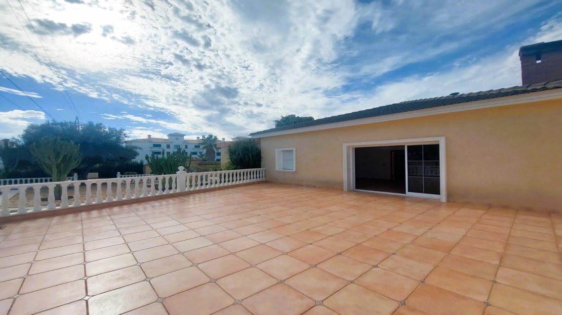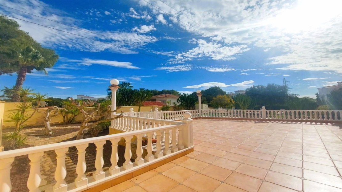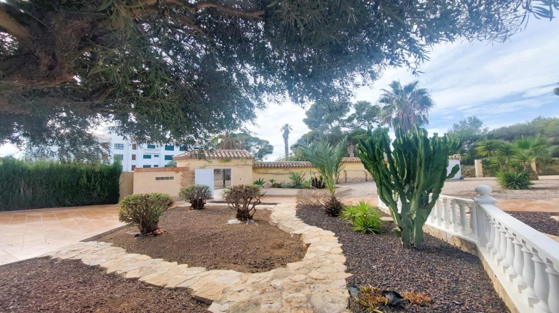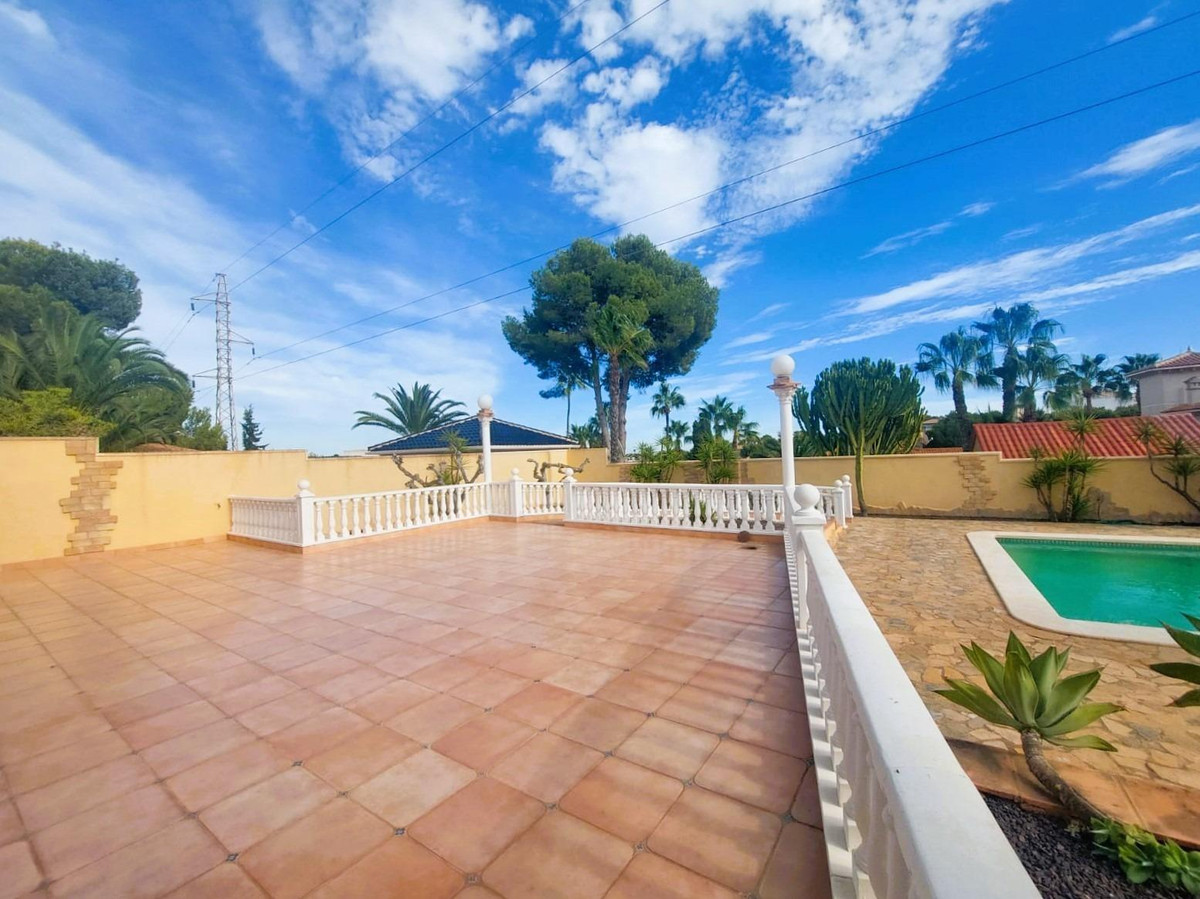 Spacious and bright detached villa with a beautiful garden of almost 1.500m2. Built and refurbished to the highest standards and fully legalised.. . There is a lot to tell about this spectacular villa:. – 296m2 built on 1 floor. – Southeast facing. – Lovely large swimming pool. – 2 huge terraces facing south and east respectively. – Very well kept garden with a variety of dry land plants. – 4 large double bedrooms. – 2 bathrooms, 1 en-suite. – Living-dining area and separate kitchen. – Spacious inner courtyard with kitchen area. – Large closed garage with space for several vehicles and laundry area. Automatic access. – Oil heating system with radiators in all rooms.. – Fantastic insulation: floor and wall chambers. High quality doors and windows. – Automatic blinds on the larger windows/doors. – Fireplace in the living/dining room. – Handmade terracotta floor . – Security door. – Well that collects water from the roofs via sewage system. Ideal for watering the extensive garden with irrigation system.. – Possibility to extend the house, on one of the large terraces, as it has been cemented and built with reinforced beams.. – Located at the end of a cul-de-sac, so it is very quiet..