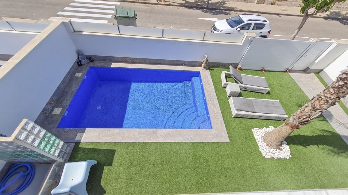 Enjoy the privacy of your 18 m² swimming pool, surrounded by an extensive garden, a cosy terrace and a solarium perfect for relaxing. In addition, the villa includes a laundry room and a storage room at the rear for added convenience.