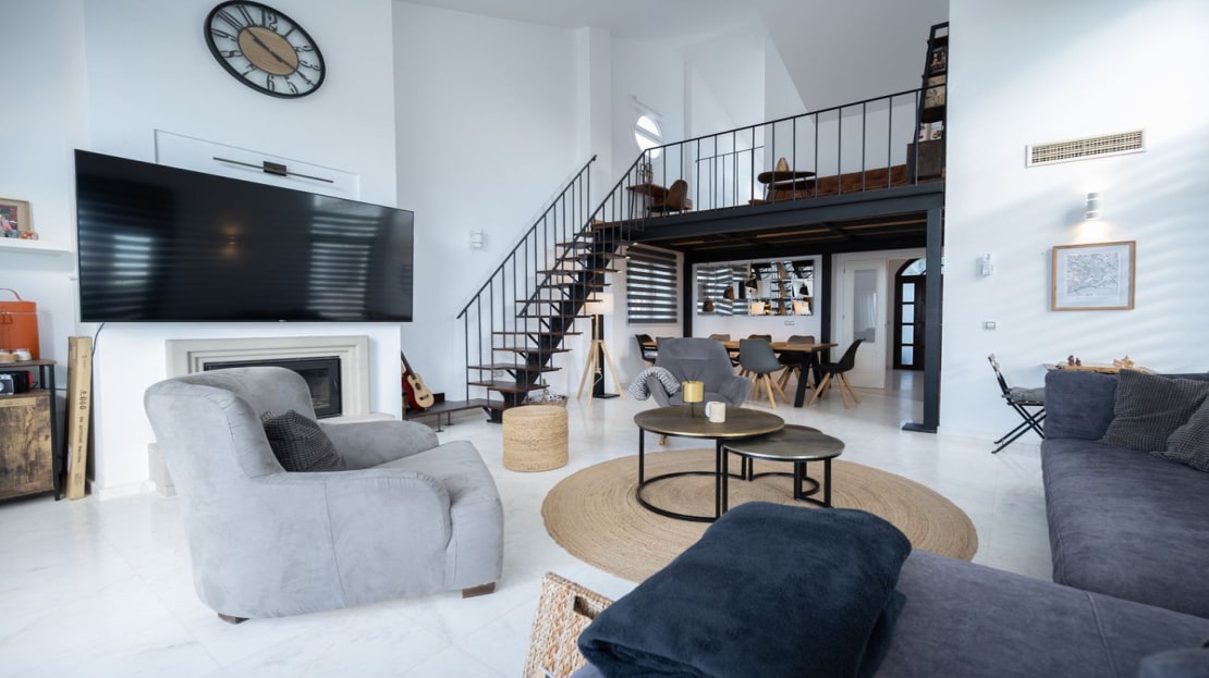 The open-plan living area boasts soaring double-height ceilings and a cozy fireplace, creating an inviting atmosphere perfect for relaxation and entertaining.