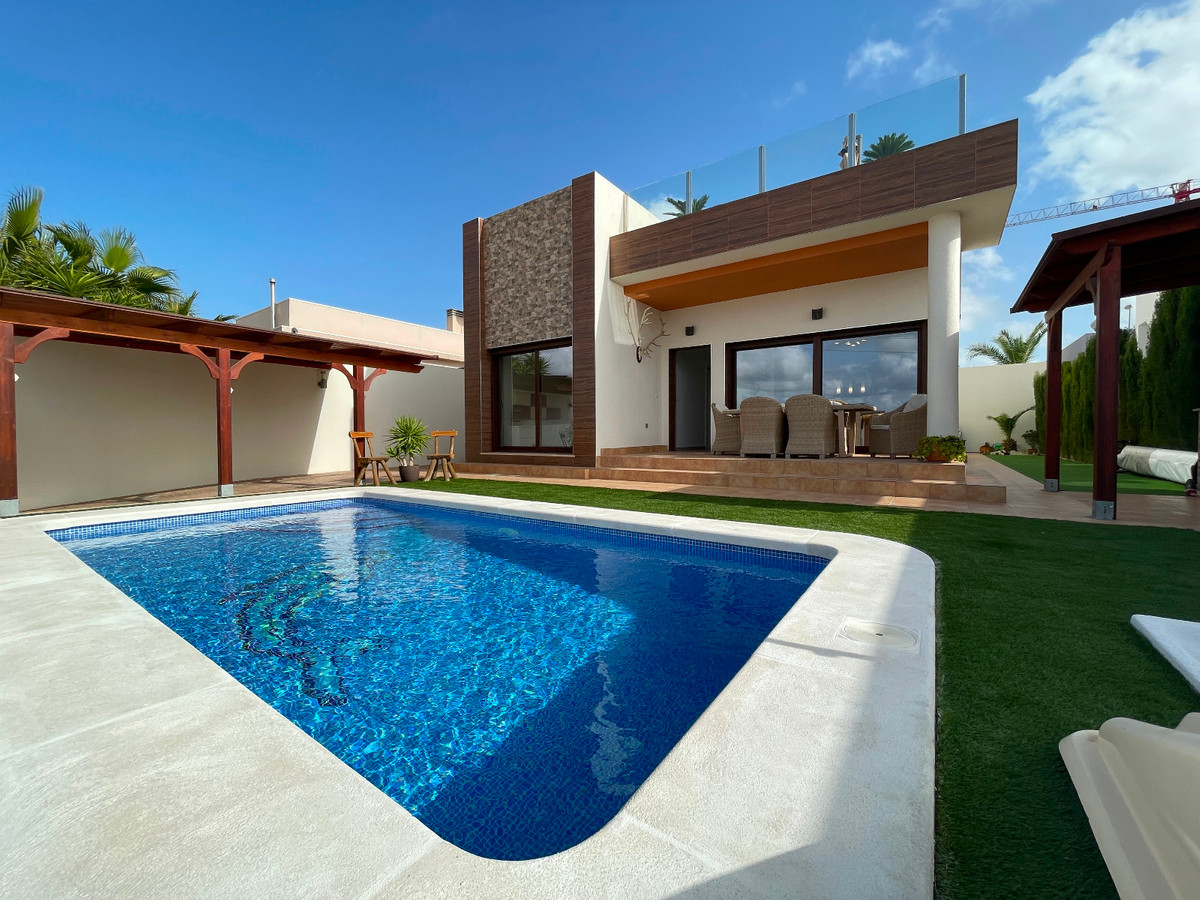 Located in a highly sought-after area of Rojales, between Ciudad Quesada and Benimar, this stunning villa is perfect for comfortable living.The property features 4 spacious bedrooms, 2 bathrooms, and a guest toilet. It is sold fully furnished and includes a modern open-plan kitchen, fully equipped with appliances. Enjoy independent air conditioning zones and a bright living room with mountain views.The outdoor area boasts a private pool, covered parking on the plot with space for several vehicles, and a large solarium with spectacular views.Annual IBI: €300. No community fees.