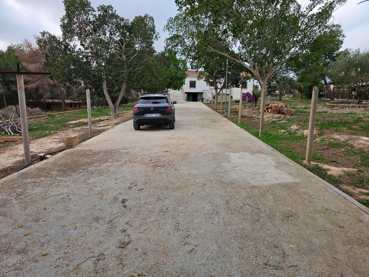 There is a large concrete driveway to the