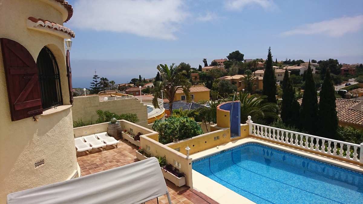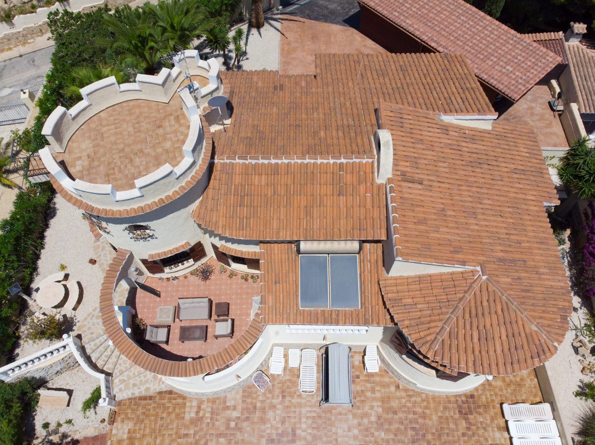 This traditional villa is located in the Cumbre del Sol residential resort. There are sea views from the terrace as well as from all rooms. The villa is spread over three floors. The ground floor comprises a lounge with a fireplace, a dining room, a kitchen, three double bedrooms, one with an en suite bathroom, a separate bathroom, a naya and a terrace. In the tower there is a fourth bedroom with access to the roof terrace where you can enjoy breathtaking 180º views. The basement comprises a fifth bedroom with a bathroom and a storage room. Outside is a swimming pool with a large terrace, an outdoor shower and an outdoor kitchen with a barbecue. There is also large driveway and a carport with space for two cars. The villa is surrounded by a Mediterranean garden with automatic irrigation. Cumbre del Sol is located in Benitachell municipality between Jávea and Moraira. Several beautiful beaches are less than a km away, there is also a large international school, a supermarket, a pharmacy and several bars and restaurants.