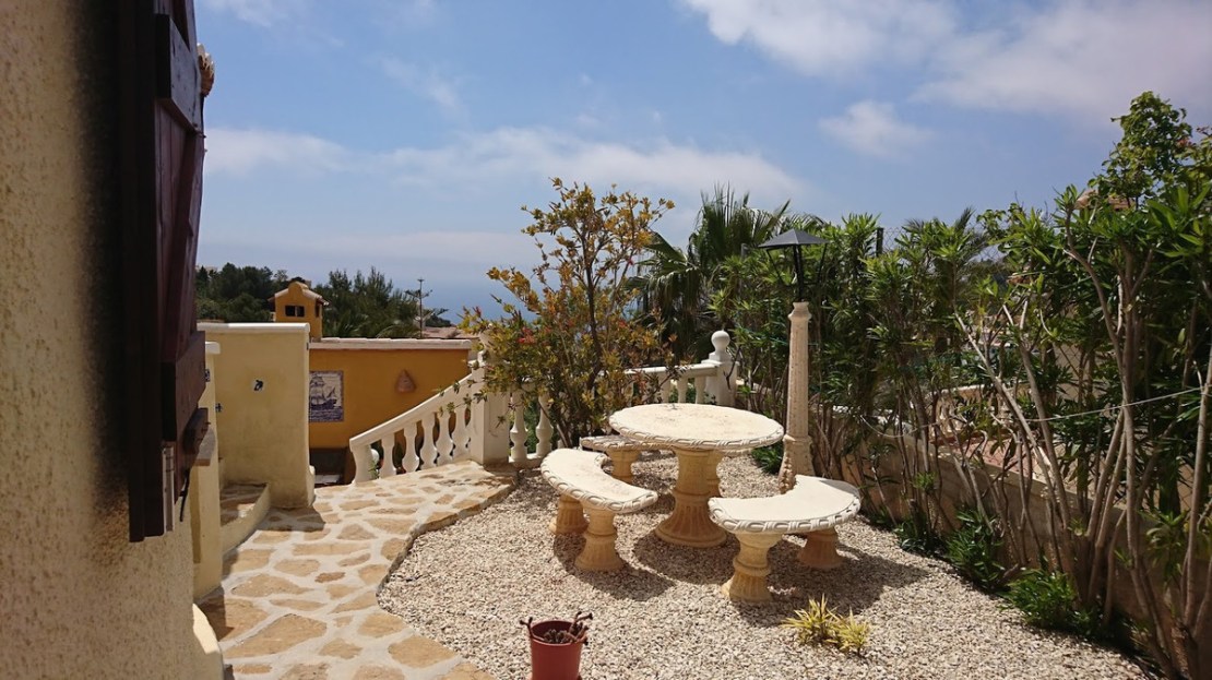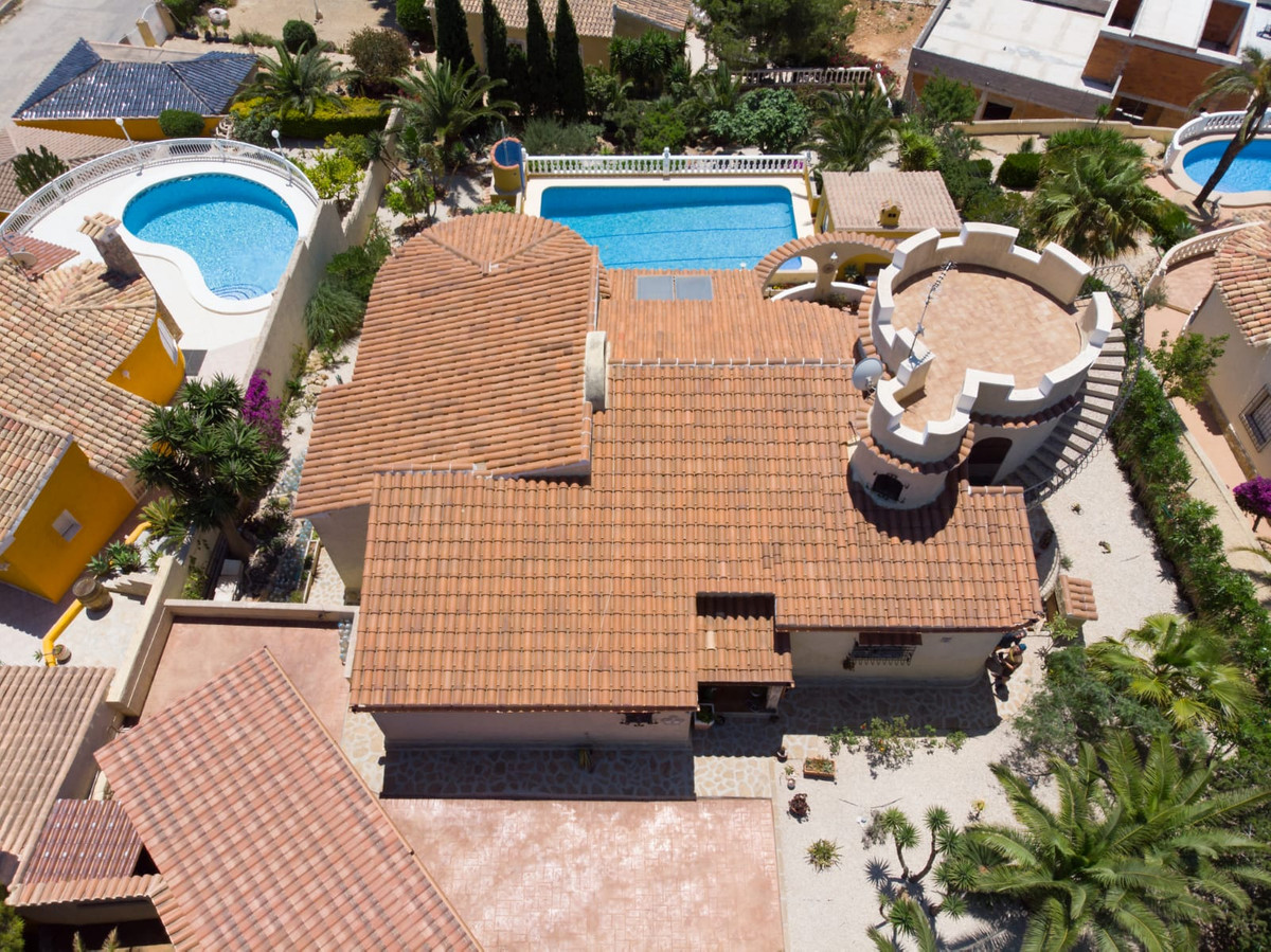 This traditional villa is located in the Cumbre del Sol residential resort. There are sea views from the terrace as well as from all rooms. The villa is spread over three floors. The ground floor comprises a lounge with a fireplace, a dining room, a kitchen, three double bedrooms, one with an en suite bathroom, a separate bathroom, a naya and a terrace. In the tower there is a fourth bedroom with access to the roof terrace where you can enjoy breathtaking 180º views. The basement comprises a fifth bedroom with a bathroom and a storage room. Outside is a swimming pool with a large terrace, an outdoor shower and an outdoor kitchen with a barbecue. There is also large driveway and a carport with space for two cars. The villa is surrounded by a Mediterranean garden with automatic irrigation. Cumbre del Sol is located in Benitachell municipality between Jávea and Moraira. Several beautiful beaches are less than a km away, there is also a large international school, a supermarket, a pharmacy and several bars and restaurants.