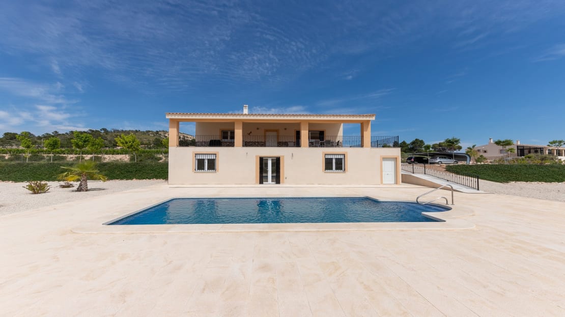 Magnificent newly built villa for an exceptional price! This fantastic villa is located in the Novelda area. The main house and other buildings add up to a total of 180 square meters built, located on a 10,000 m2 plot, of which approximately 3,500 m2 are fully fenced. You have the option of choosing the finished basement or a separate guest house. The price includes the 4 x 8 m2 pool and kitchen furniture of your choice of excellent quality. The main house consists of a large bright living room, a good size kitchen distributed as you wish, 3 bedrooms and 2 bathrooms. Also in the basement or guest house you will have 2 more bedrooms and 1 bathroom. The house has Air Conditioning.You will be the one who chooses aspects such as: kitchen furniture, tiles, flooring, doors, color of the windows, color of the façade, stone of the façade … make your magnificent chalet your unique home!We are specialists in the Costa Blanca and Costa Calida specialising in the Alicante and Murcia Inland regions with a particular emphasis on Elda, Pinoso, Aspe, Elche and surrounding areas. We are an established, well known and trusted company that has built a solid reputation amongst buyers and sellers since we began trading in 2004. We offer a complete service with no hidden charges or surprises, starting with sourcing the property, right through to completion, and an unrivalled after sales service which includes property management, building services, and general help and advice to make your new house a home. With a portfolio of well over 1400 properties for sale, we are confident that we can help, so just let us know your preferred property, budget and location, and we will do the rest.