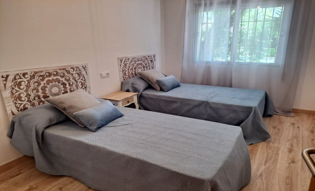 1st bedroom with two sliding windows and a balcony overlooking the back of the garden