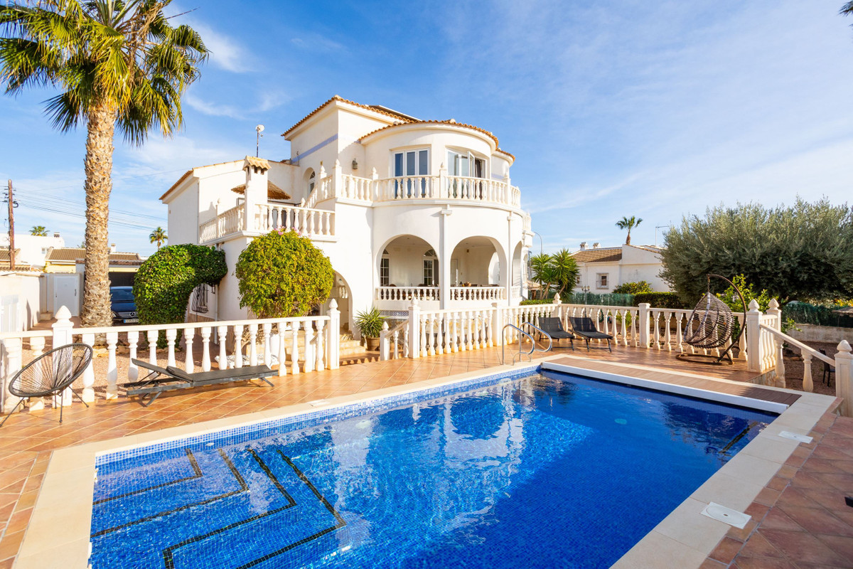 Elegant villa with fantastic light flow and private pool A warm welcome to this elegant villa with a nice location in El Chaparral. The villa, which consists of five bedrooms, four bathrooms, living room and kitchen, was renovated in 2015 and is in very good condition. On the large plot there is a private pool (heated) and plenty of space for outdoor furniture and sun loungers.