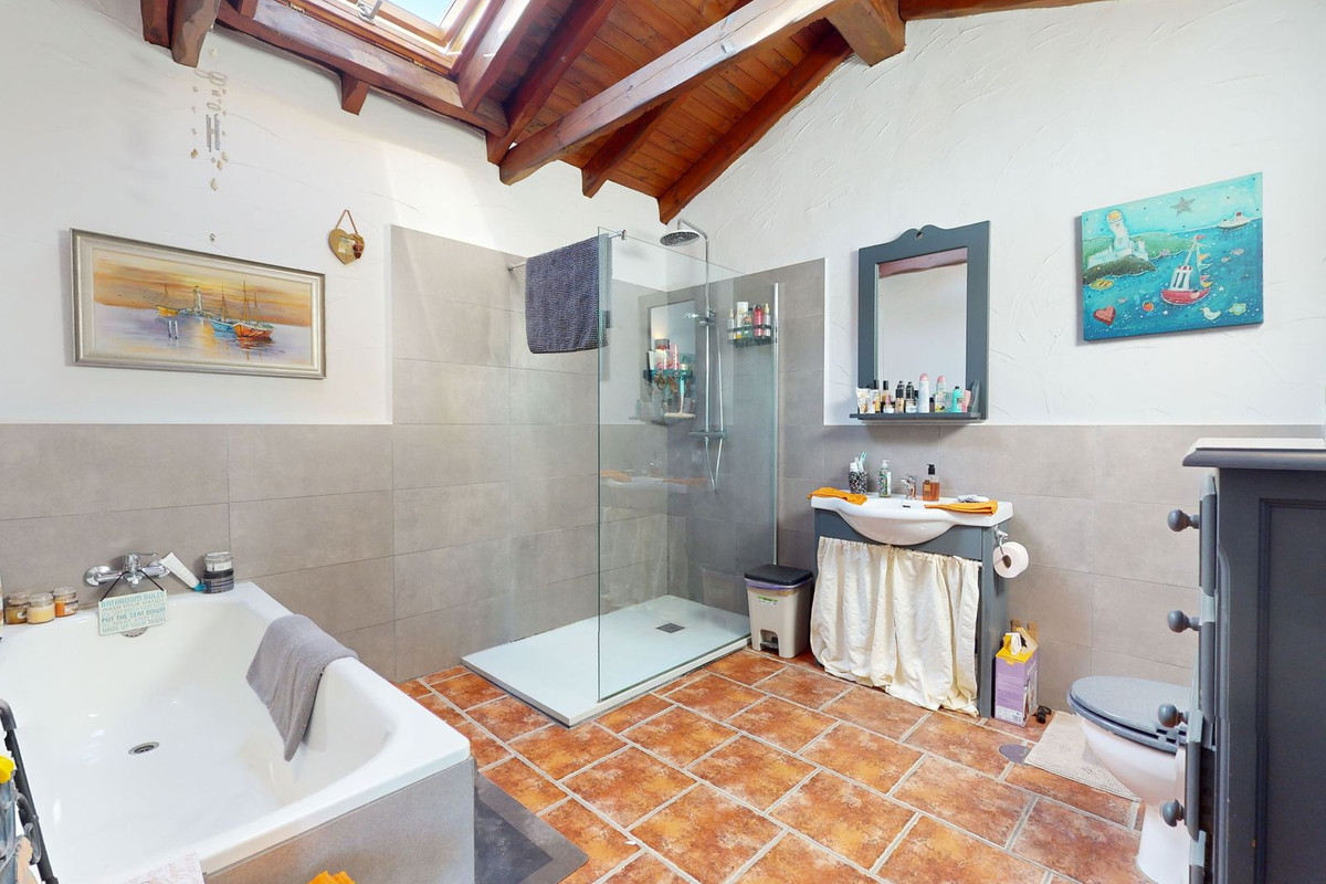 The interior boasts a spacious living area with ample natural light, creating a welcoming ambiance. Vaulted ceilings on both lower and upper floor enhance the sense of space, while traditional wooden doors add a touch of authenticity. The property's layout is both practical and versatile, offering comfortable family living, including plenty of space for guests and home offices.
