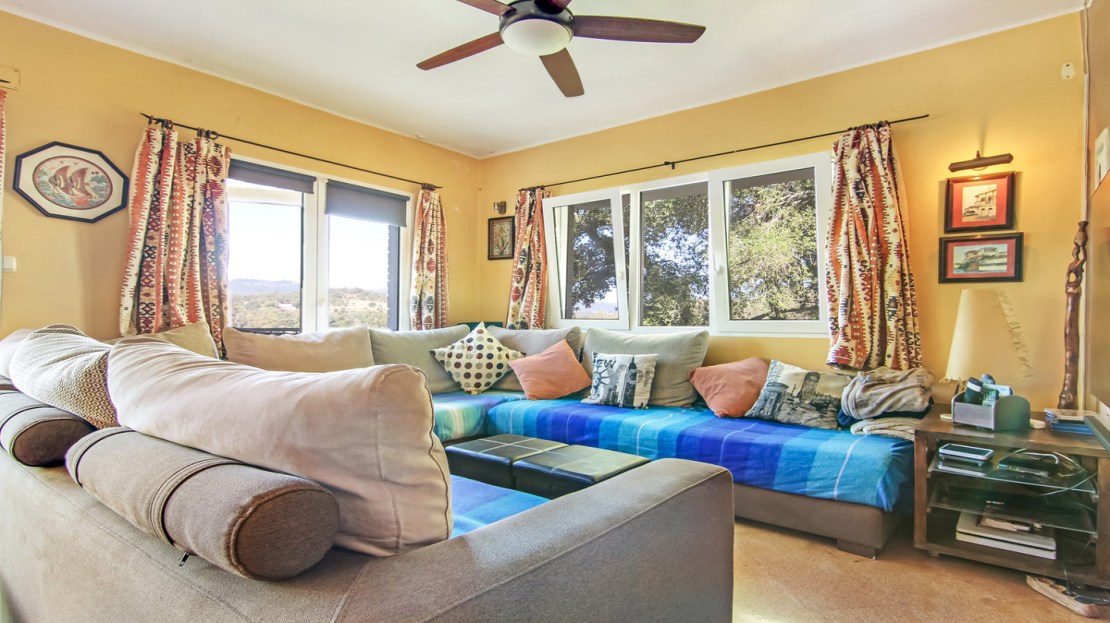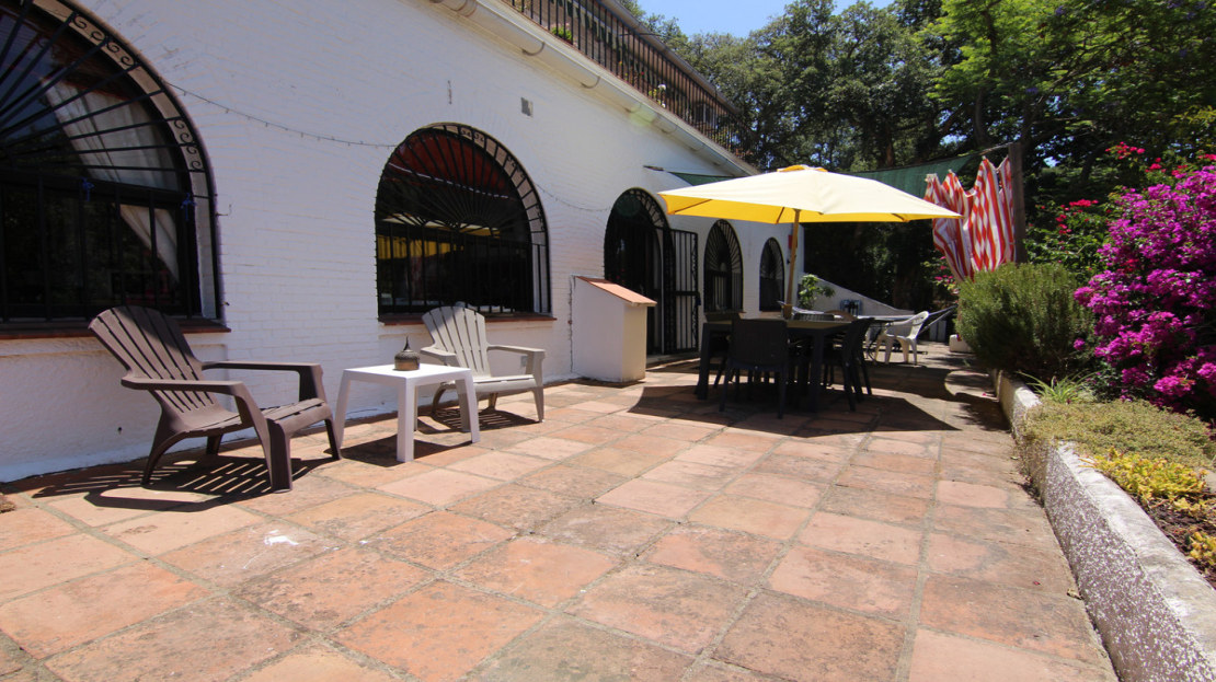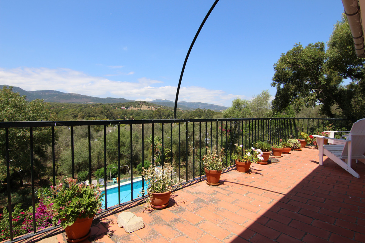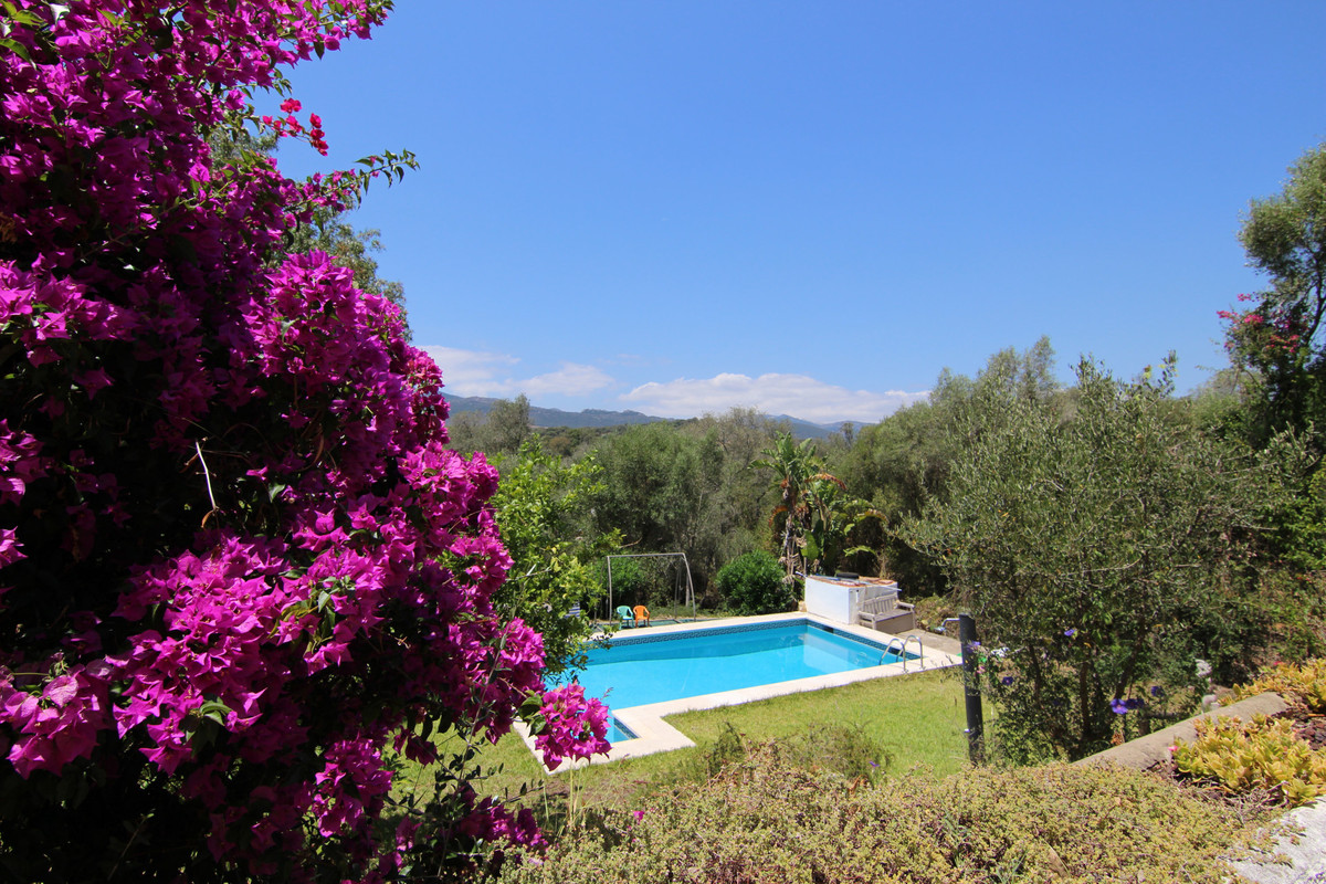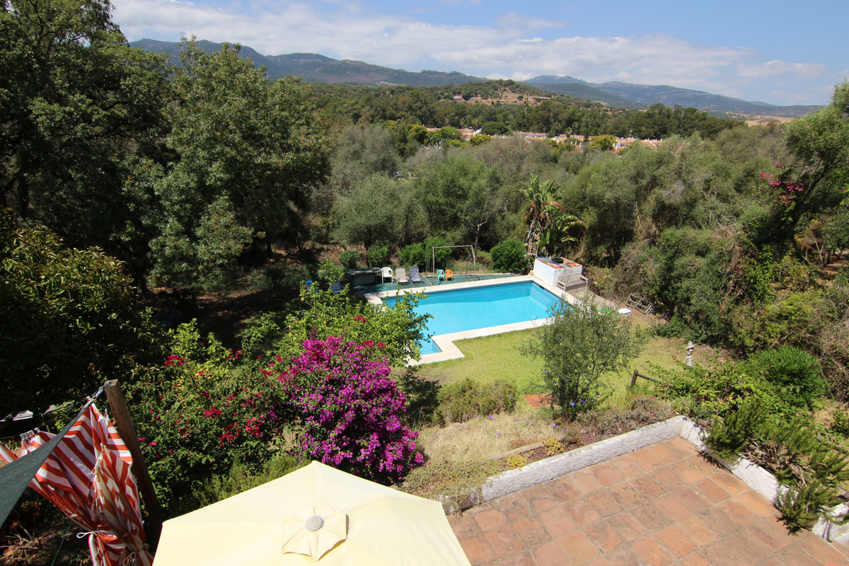 Upstairs there are 3 spacious bedrooms (or 4 if you count the study as a bedroom), 2 bathrooms, a very spacious living room with open fireplace, segregated tv and dining areas as well as panoramic windows and south-facing big balcony to enjoy those stunning views across the Alcornocales National Park forests and mountains, bird watching and star gazing. The beautifully tiled kitchen leads through to a separate laundry room which opens to an outside covered dining/living area. The large upper garden includes plenty of lawn, an outdoor kitchen with bbq, as well as the garage and enclosed large parking area (although the kids preferred to call it the football and basketball ground!).