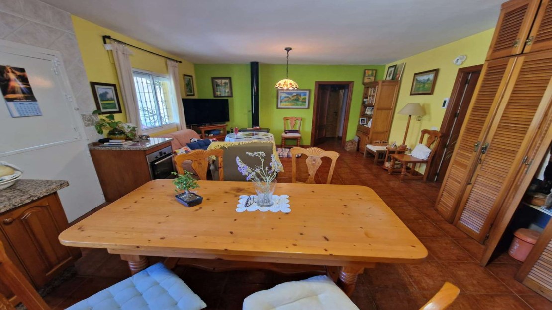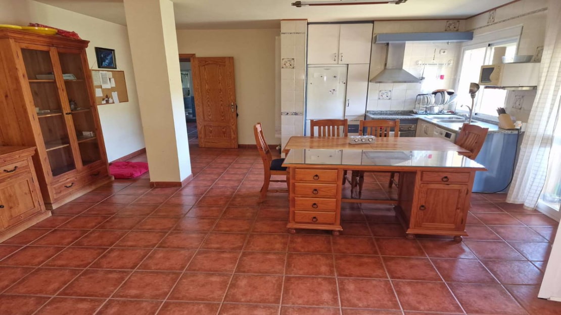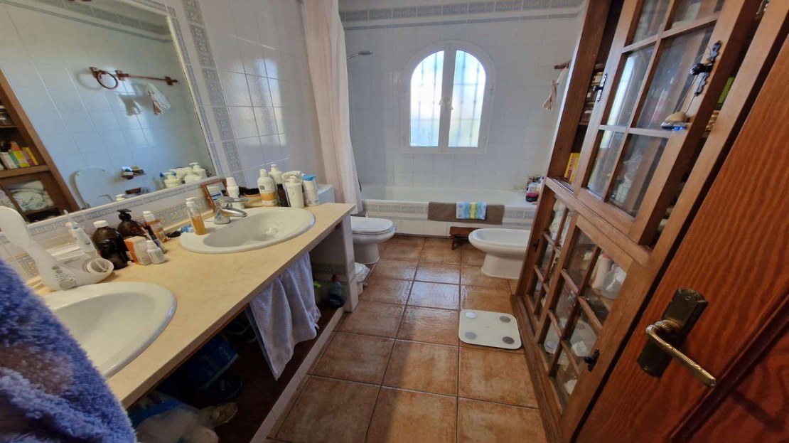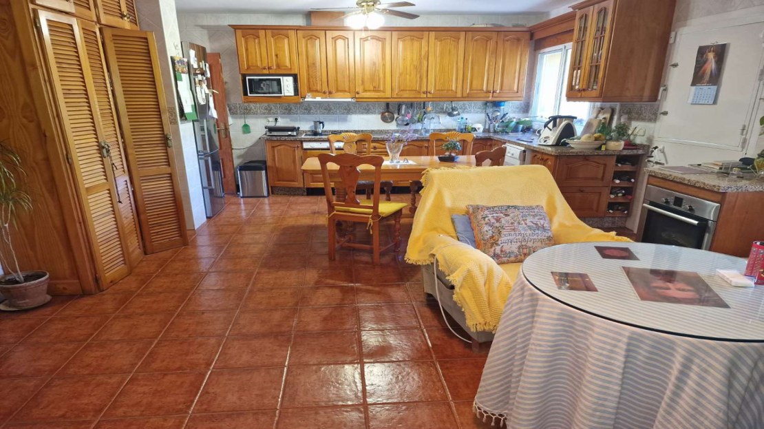 3331-V In the lower part of Pinos de Alhaurin urbanization for sale this spacious villa on a 2500 meter fenced plot, consists on the ground floor of a living room with fireplace and air conditioning, a fitted kitchen with utility room, three large bedrooms with wardrobes, two bathrooms, 1 en suite, a glazed porch that is used as a winter lounge, on the first floor with their separate entrances there are two apartments, the first with a furnished American kitchen-dining room, two bedrooms, 1 bathroom, 1 terrace, the second with a living room with a fitted kitchen, one bedroom, 1 bathroom, on the plot there is another independent house on one level with a living room with a fitted kitchen, 1 bedroom, 1 bathroom, several air conditioners, several car spaces on the plot, Jacuzzi on the plot with barbecue area, perfect for vacation rental or large family. AGENCY FEES ARE NOT INCLUDED IN THE SALE PRICE.
