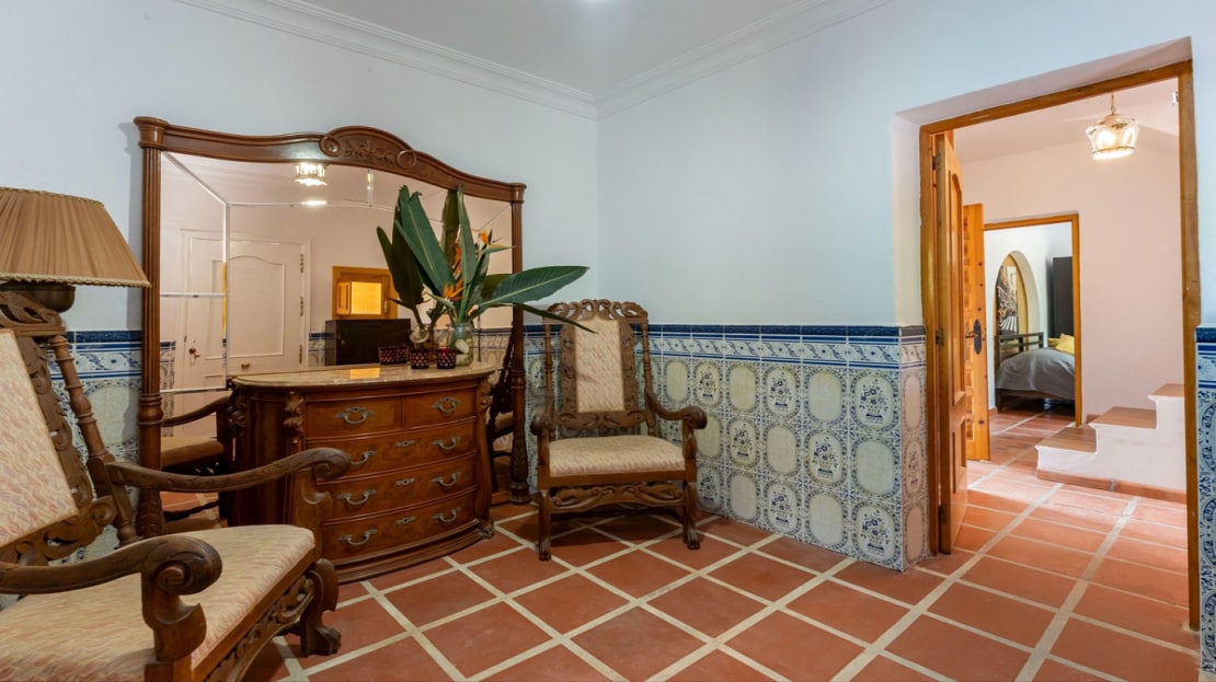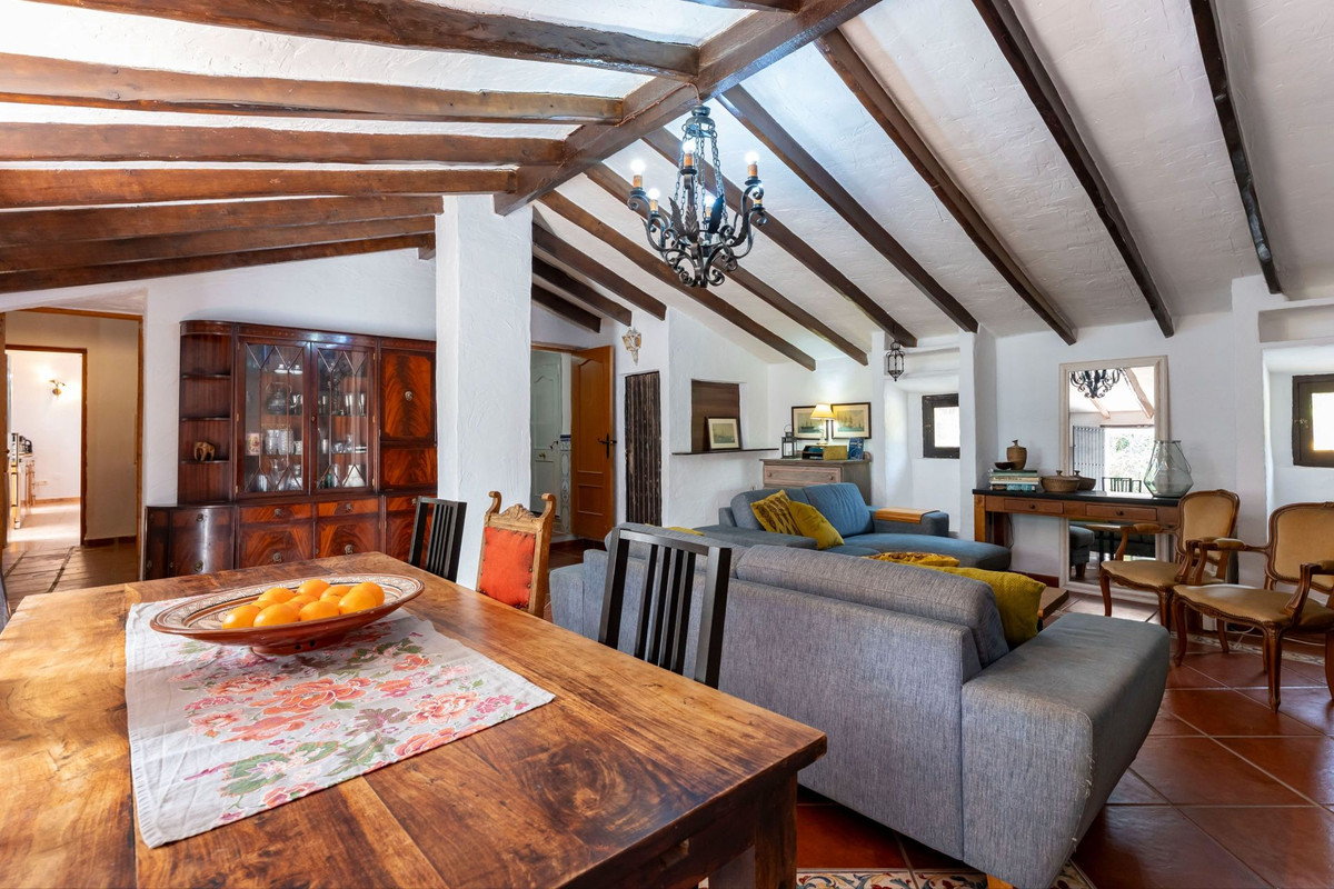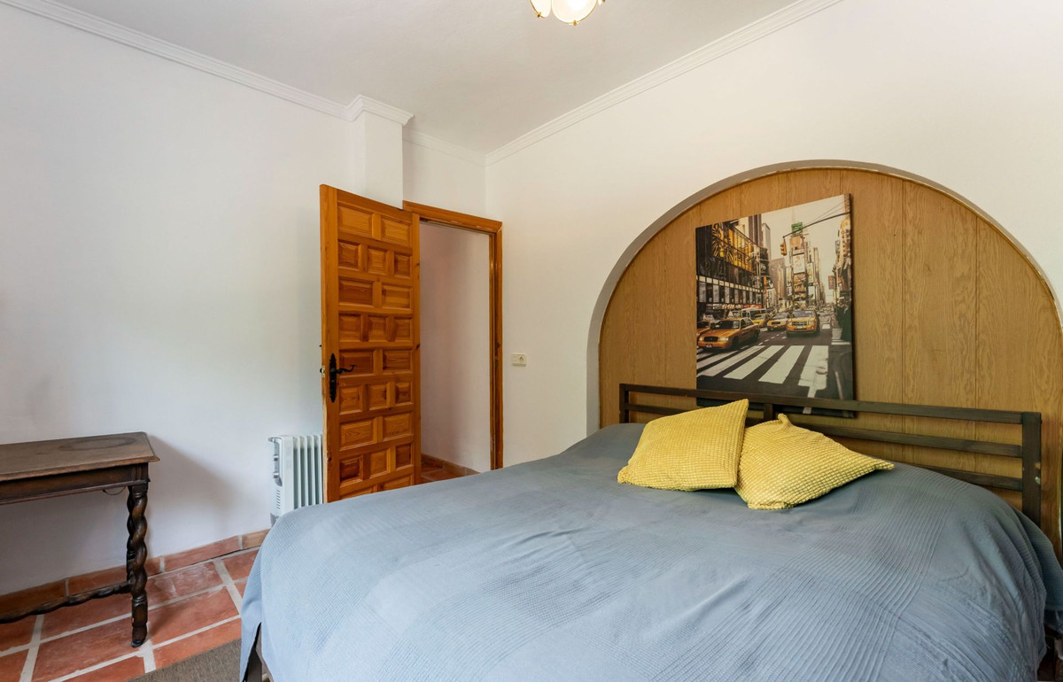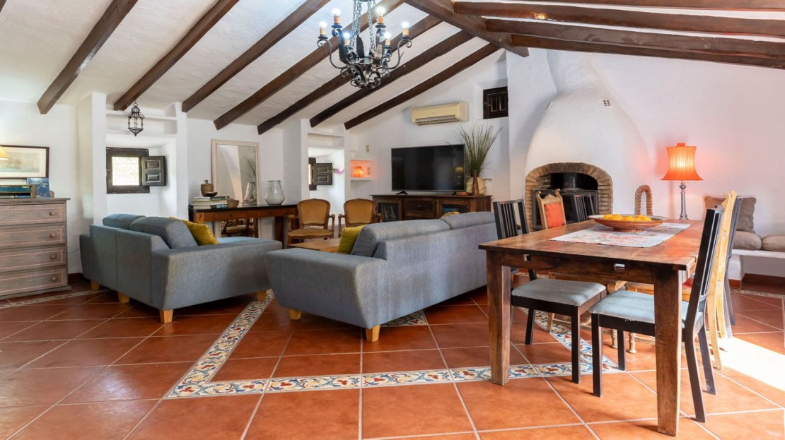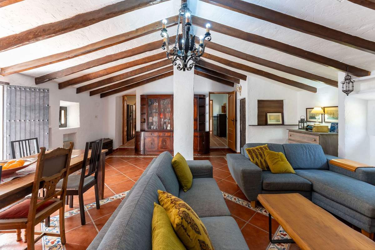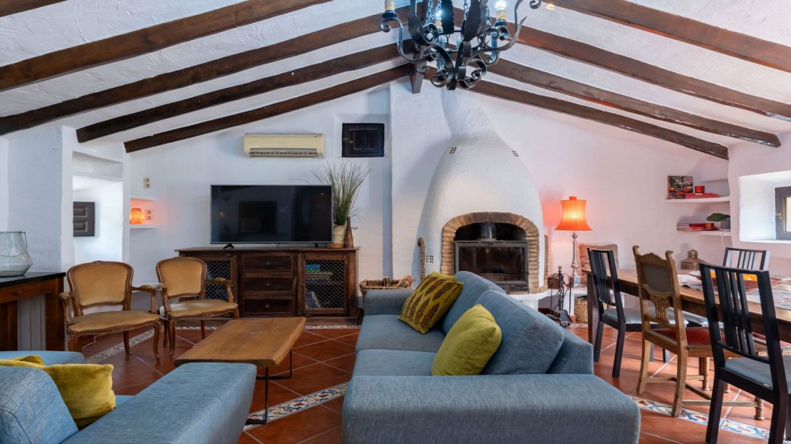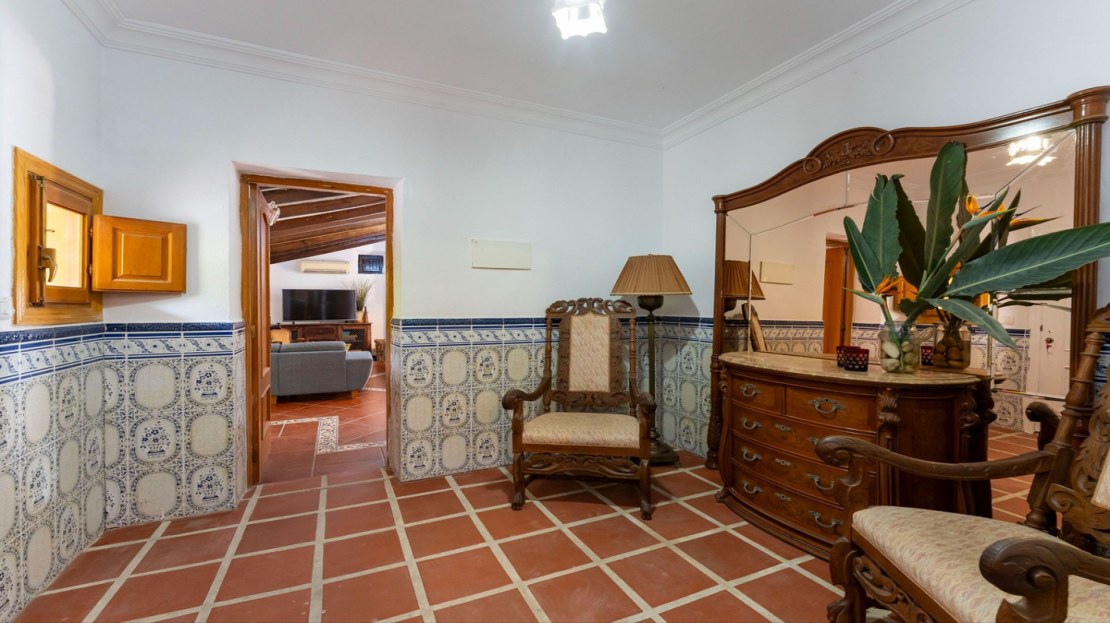 The main house is thoughtfully distributed over two floors, blending Andalusian charm with mod-ern comfort. Upon entering, you are welcomed by a traditional Andalusian-style entrance hall. To the left, the cozy living room features vaulted wooden ceilings, a striking feature fireplace, air conditioning, and four charming original wooden windows. This space opens directly onto a spa-cious terrace, perfect for outdoor relaxation.
