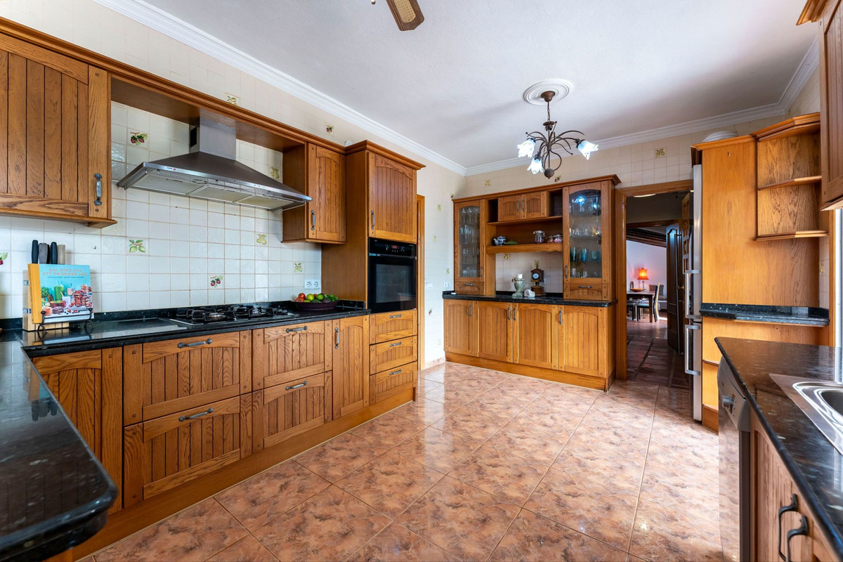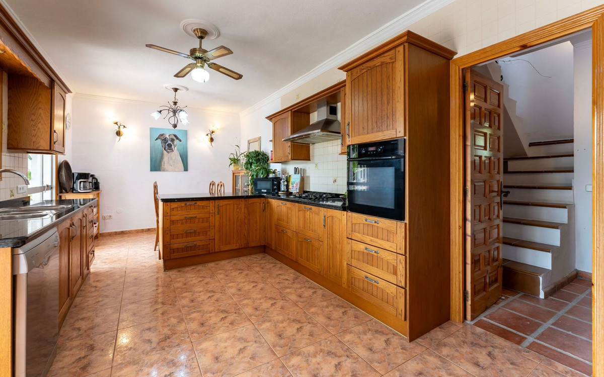 At the rear of the living room, a utility room leads into a generously sized, fully equipped kitchen with an adjoining dining area. This space also offers direct access to the main terrace, creating a seamless indoor-outdoor flow.