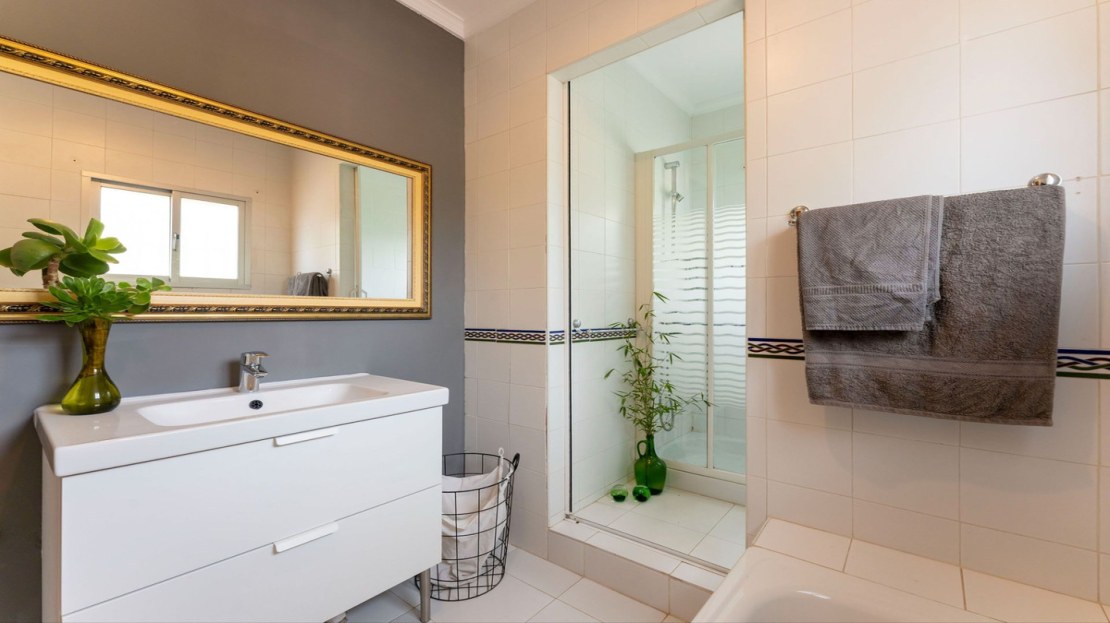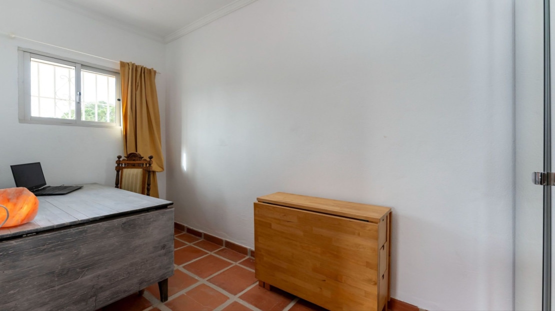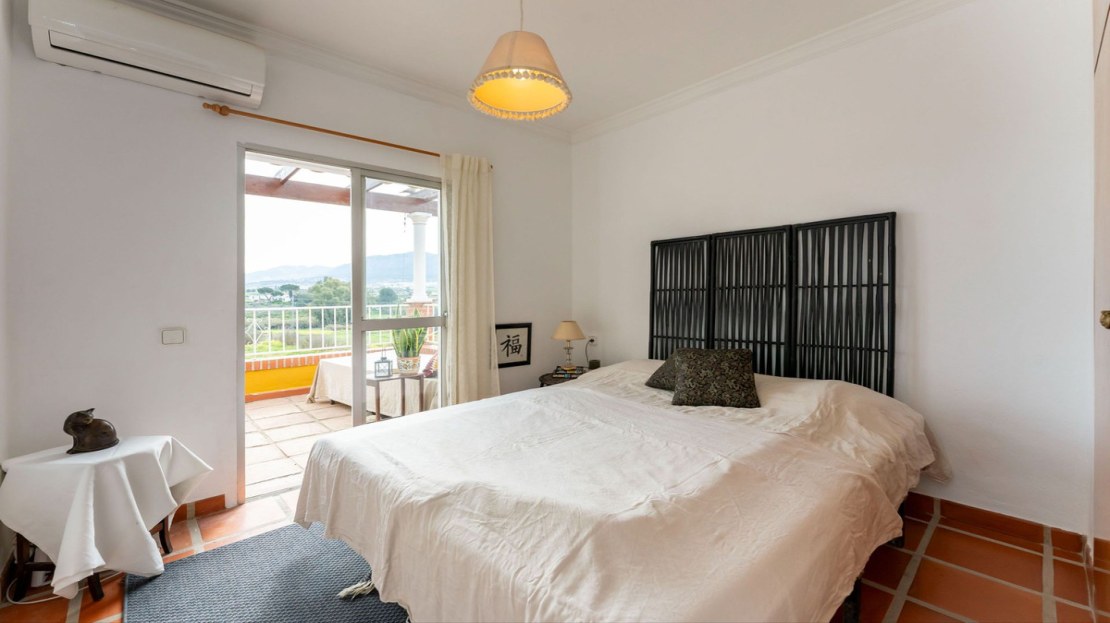 Off the entrance hallway, you’ll find a guest cloakroom and a comfortable double bedroom with air conditioning. A staircase leads to the first floor, where two additional double bedrooms, in-cluding the master bedrooms with ensuite bathroom, both with air conditioning, open onto a large balcony offering panoramic views. This floor also includes a well-sized family bathroom and an additional smaller room, ideal as a study, office, or potentially a dressing room.