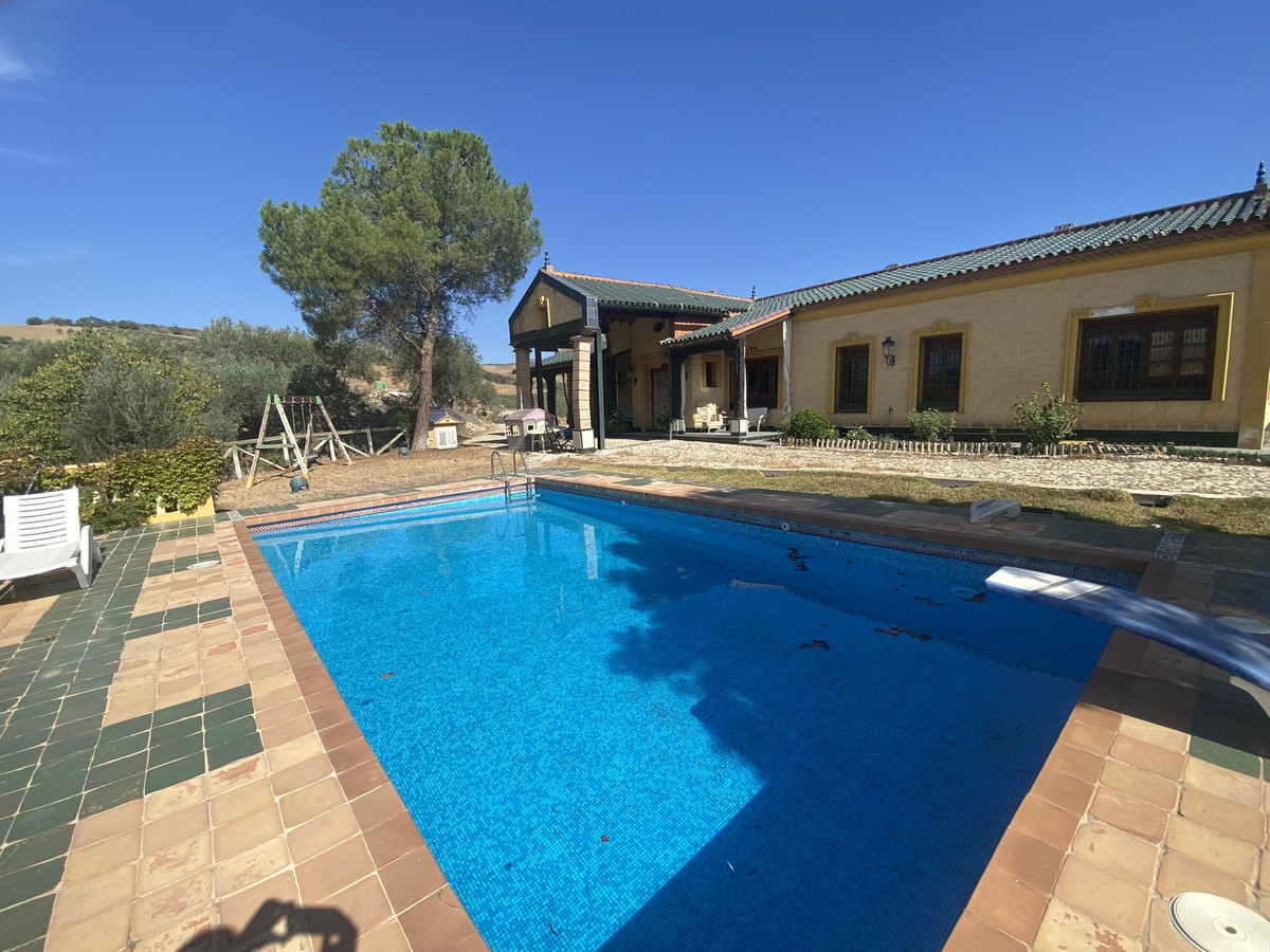 UNIQUE OPPORTUNITY to obtain this wonderful ranch with more than four hectares of almost completely flat land just 20 minutes from the center of Malaga or 30 minutes from the airport. It has a house built on a single floor, with great detail, consisting of six bedrooms and four bathrooms, spectacularly spacious and bright rooms with very high ceilings equipped with wooden beams and rustic decoration, a kitchen integrated into the living room divided into two rooms. The entrance to the house can be made from several doors, from the main door with access to the hall decorated with marble columns and access to the office and bathroom and from the porch area with barbecue that accesses two doors, one per storage room and ironing room that accesses the living room through the kitchen area or another that also accesses the main hall through the back area that is connected to both doors. The entire house has hot and cold air conditioning as well as underfloor heating throughout the house. The pool area has extensive views of the countryside. In the back area there is a completely independent guest house composed of a bedroom, kitchen and full bathroom. Porch area with barbecue and Pereruela wood oven. All interior roads connect each point of the large plot, connecting with the stable area prepared for ten horses in the best conditions, the area being equipped with a kitchen, bathroom and two service rooms. Comfortable riding arena and lots of space, plantation area with 500 olive trees, of which 350 are young with olive trees, orchard area, corral area and its own well. The property also has municipal electricity and water supply. It also has a 300,000 liter tank tank.