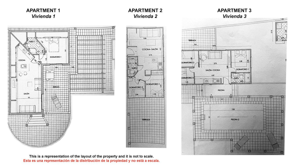 Next to these properties is a ground floor home with 2 bedrooms, 2 bathrooms, an open-plan living room and kitchen with a log-burning fire, and an external raised terrace with mountain views. The top floor is accessed externally and features a separate apartment with a spacious living room, kitchen, bedroom, bathroom, and its own private terrace with views to the bay of Málaga.